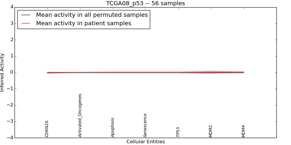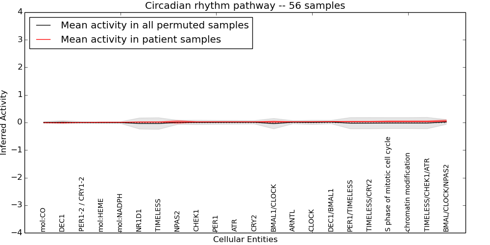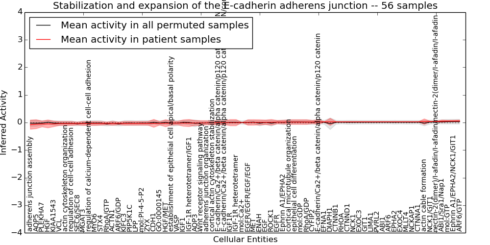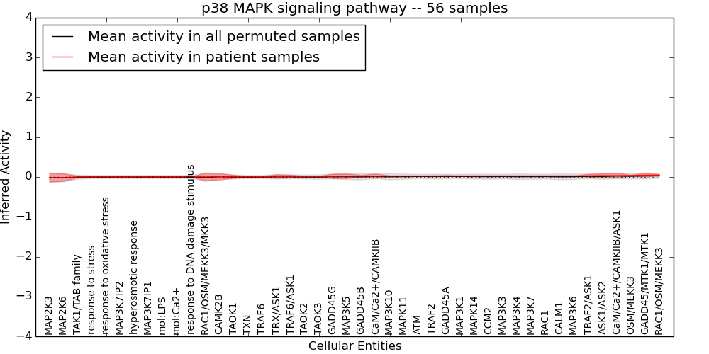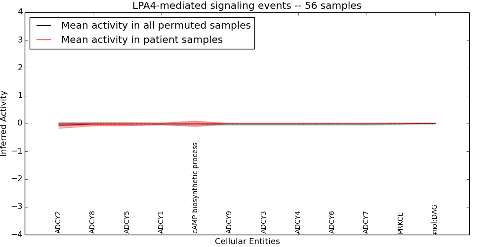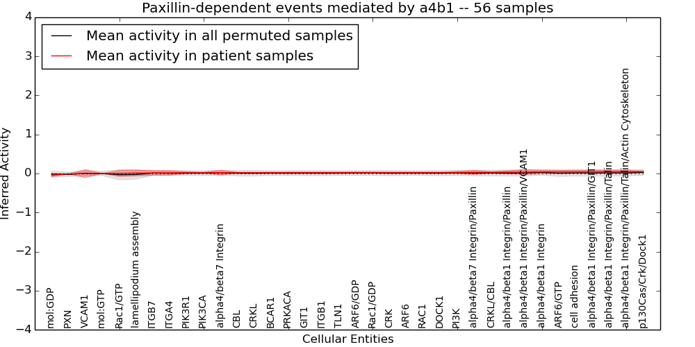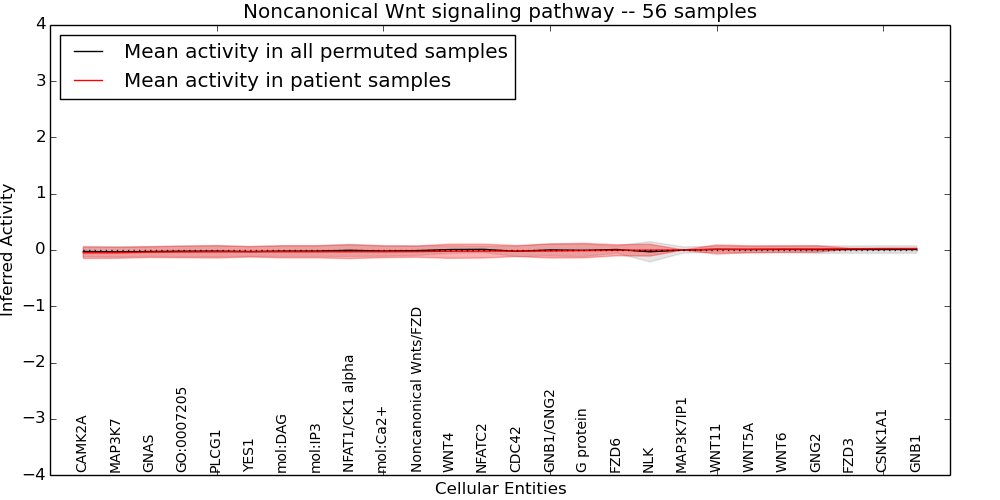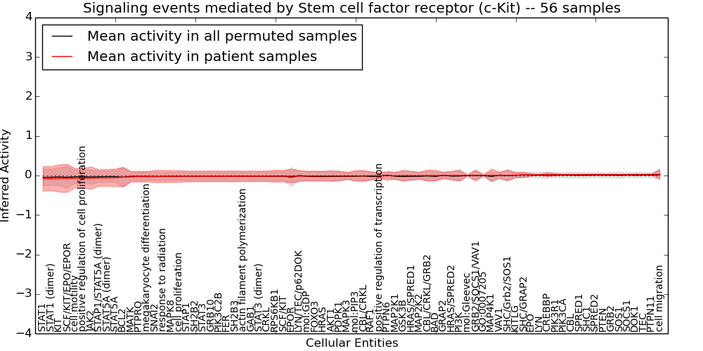 Figure S131. Get High-res Image This plot shows pathway concept perturbations across all samples against a permutation model. The concepts along the x-axis are sorted by lowest to highest mean activity for the real patient samples. Mean inferred activities are plotted along the y-axis as a colored band showing the average level and one standard deviation range. Real samples are shown in red and permuted samples in black.