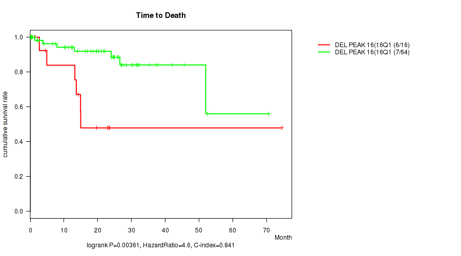 del_16q23.3 cnv correlated to 'Time to Death'.