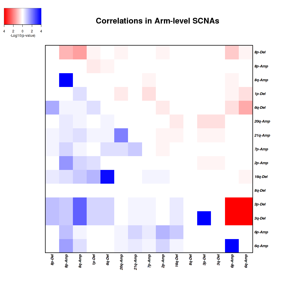 Figure 1. Get High-res Image Co-occurring and mutually-exclusive pairs for copy number variations of arm level events. Blue means two events are co-occurring and red means two events are mutually-exclusive.