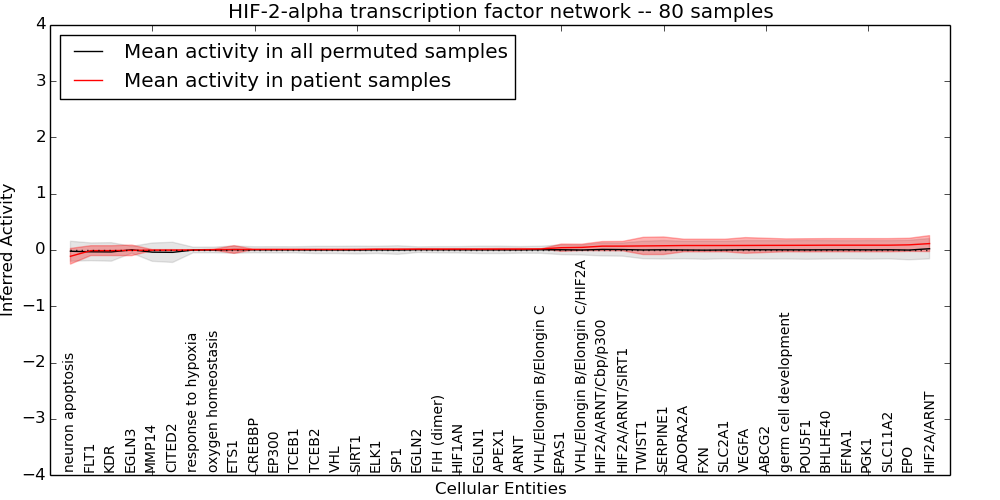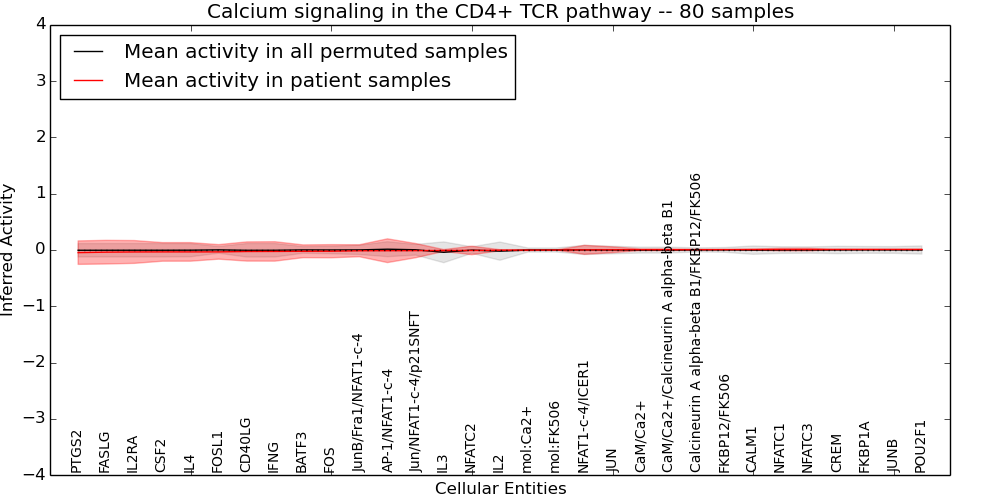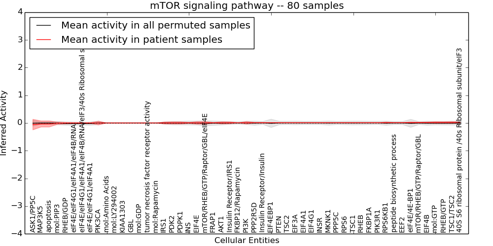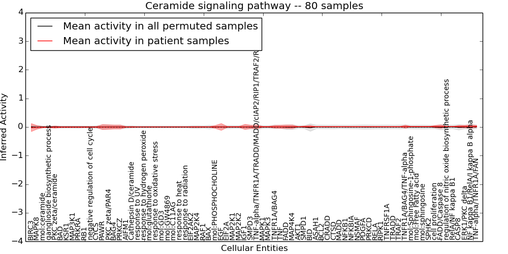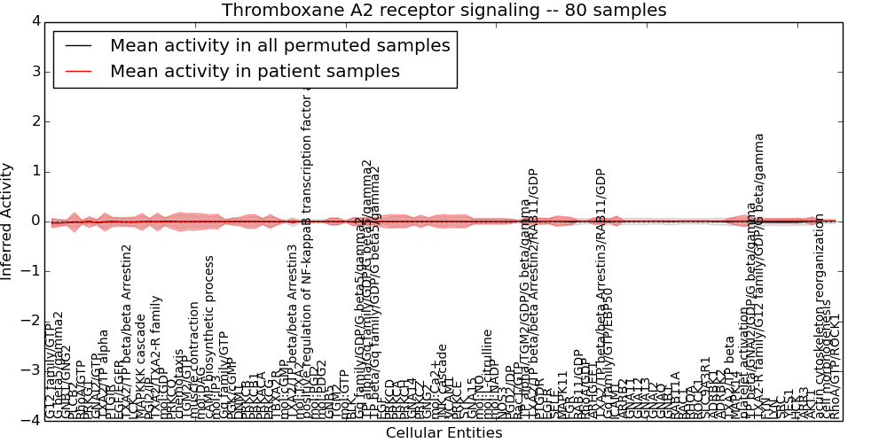 Figure S131. Get High-res Image This plot shows pathway concept perturbations across all samples against a permutation model. The concepts along the x-axis are sorted by lowest to highest mean activity for the real patient samples. Mean inferred activities are plotted along the y-axis as a colored band showing the average level and one standard deviation range. Real samples are shown in red and permuted samples in black.