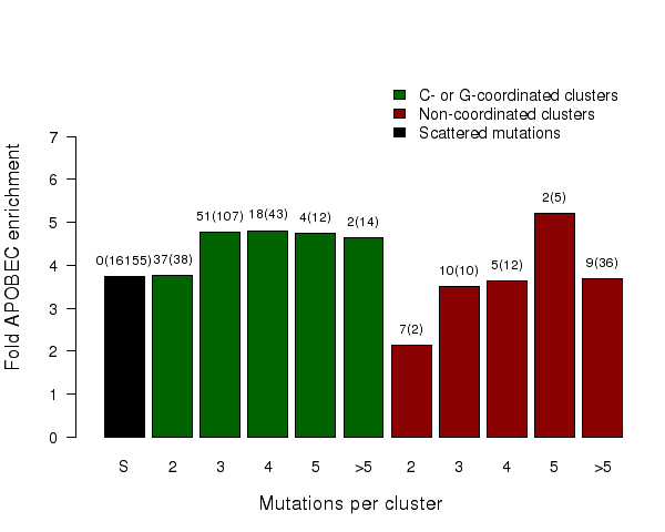 Figure 9.  Get High-res Image Fold enrichment of the APOBEC mutation signature in clusters of different sizes of two categories – C- or G-coordinated or non-coordinated as well as in non-clustered (scattered) mutations. Smaller clusters usually show less enrichment because they have a higher chance to be formed by random mutations that occurred in close vicinity to each other. Values above the bars display the total number of mutation clusters in each class and in parentheses the total numbers of APOBEC signature mutations in a category. Values for fold enrichment as well as mutation and mutation cluster counts are taken from the following output files which can be downloaded from firehose_get (https://confluence.broadinstitute.org/display/GDAC/Download):