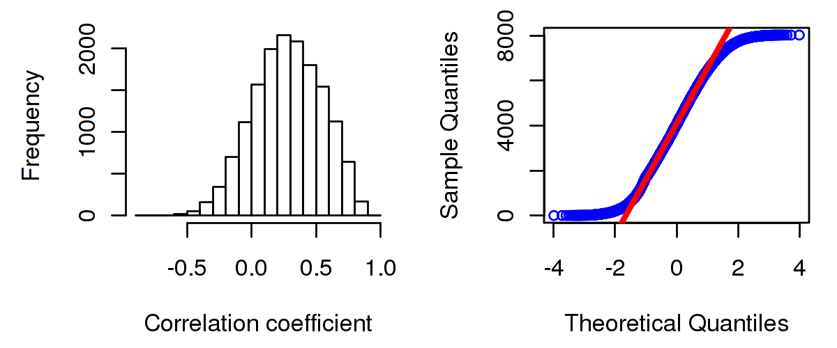 Figure 1. Summary figures. Left: histogram showing the distribution of the calculated correlations across samples for all Genes. Right: QQ plot of the calculated correlations across samples. The QQ plot is used to plot the quantiles of the calculated correlation coefficients against that derived from a normal distribution. Points deviating from the blue line indicate deviation from normality.