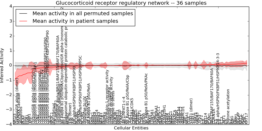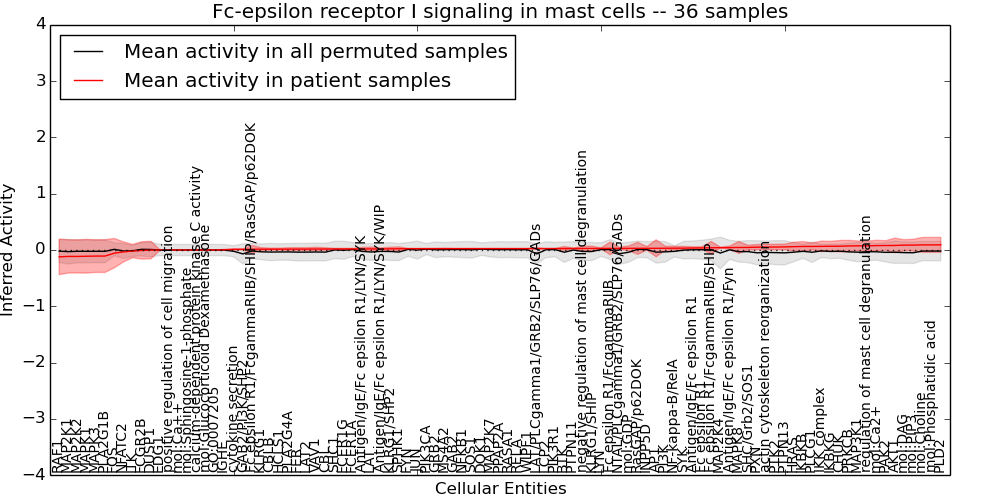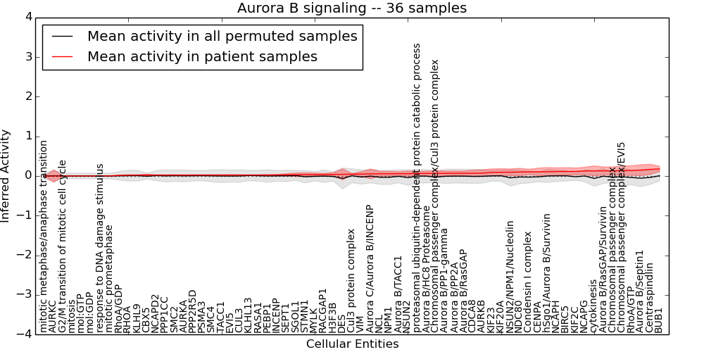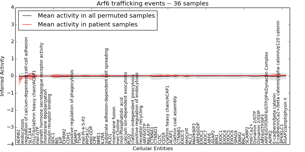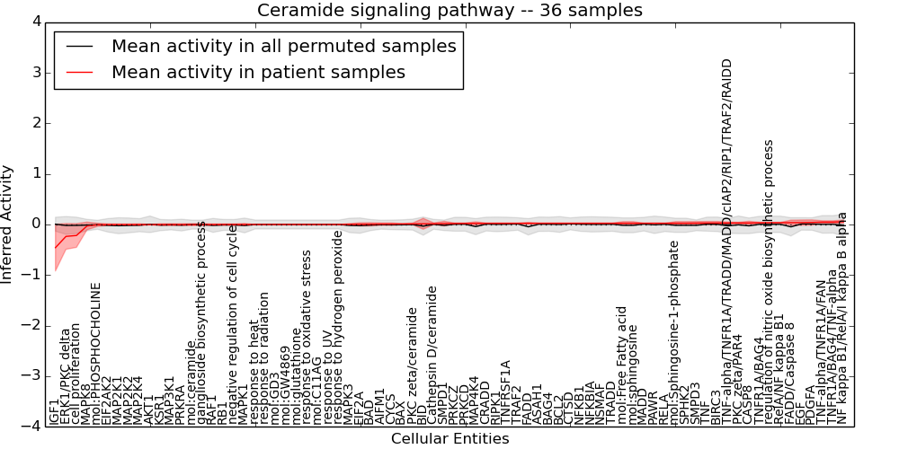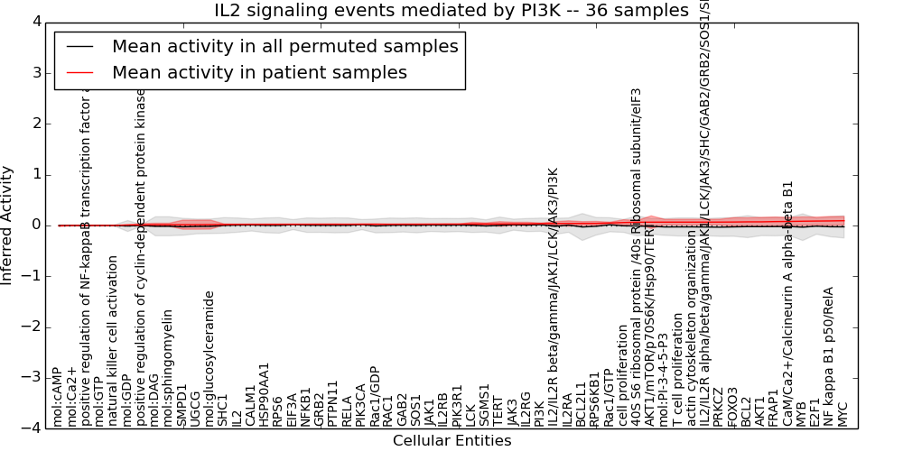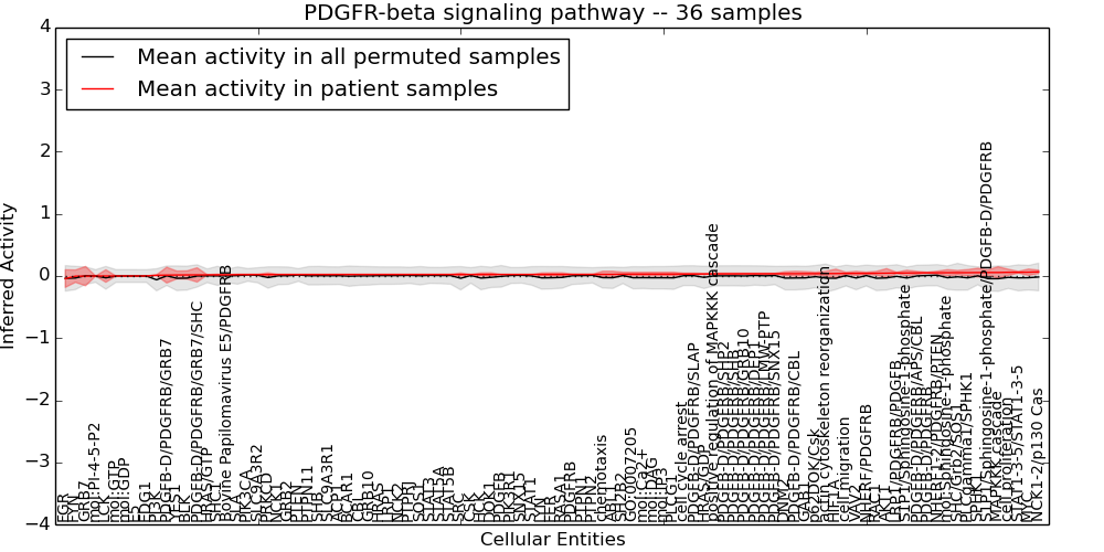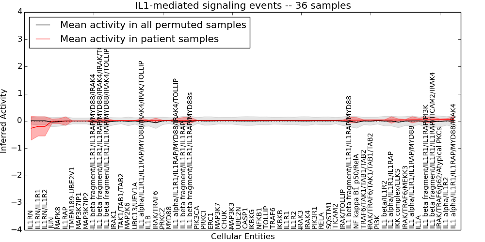 Figure S131. Get High-res Image This plot shows pathway concept perturbations across all samples against a permutation model. The concepts along the x-axis are sorted by lowest to highest mean activity for the real patient samples. Mean inferred activities are plotted along the y-axis as a colored band showing the average level and one standard deviation range. Real samples are shown in red and permuted samples in black.