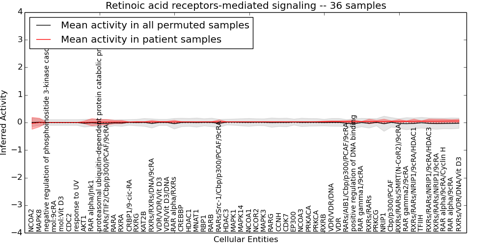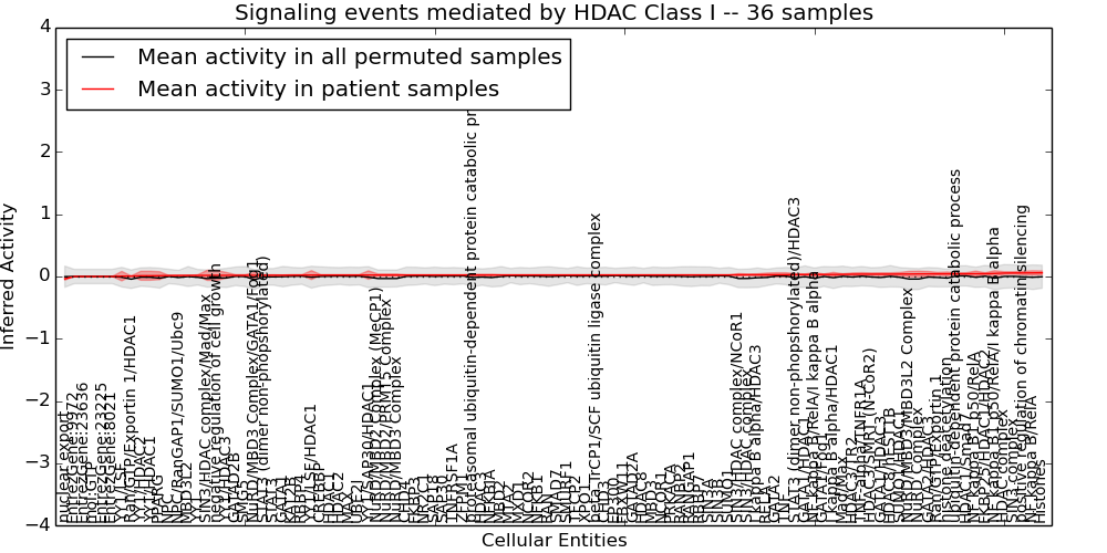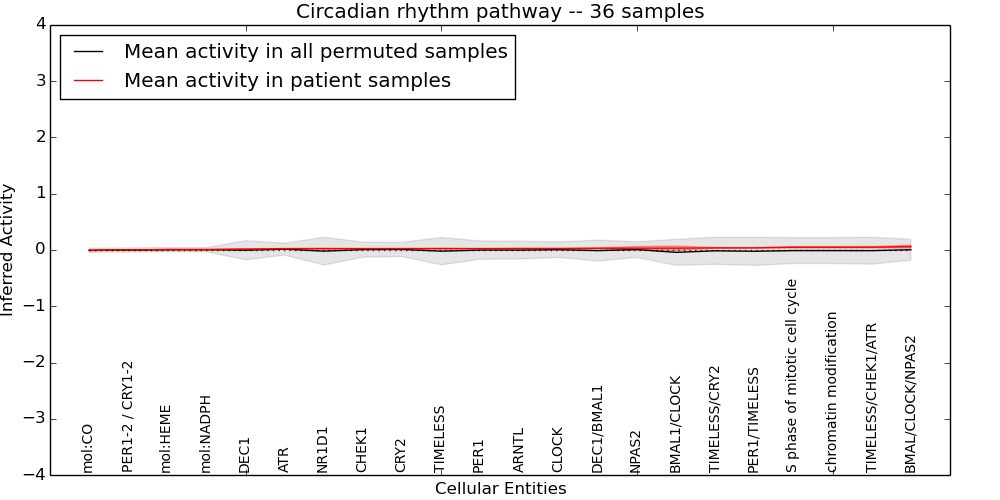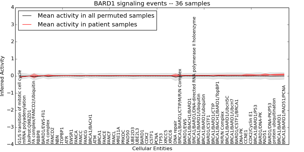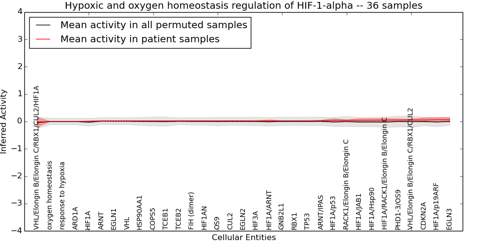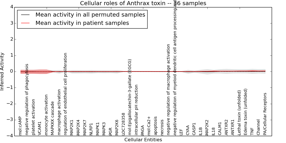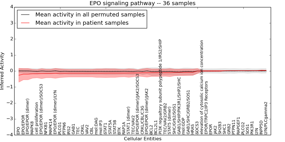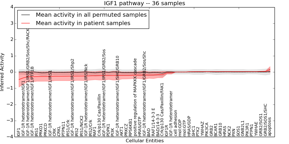 Figure S131. Get High-res Image This plot shows pathway concept perturbations across all samples against a permutation model. The concepts along the x-axis are sorted by lowest to highest mean activity for the real patient samples. Mean inferred activities are plotted along the y-axis as a colored band showing the average level and one standard deviation range. Real samples are shown in red and permuted samples in black.