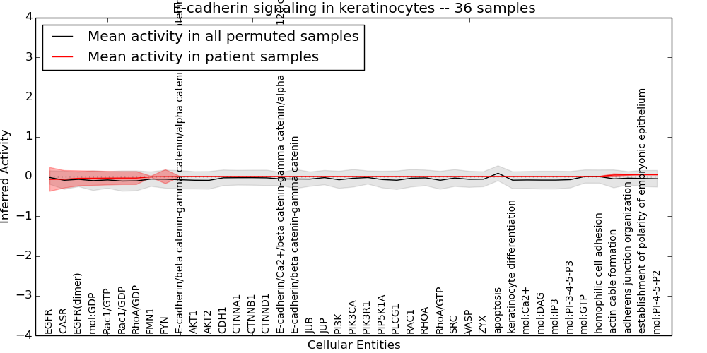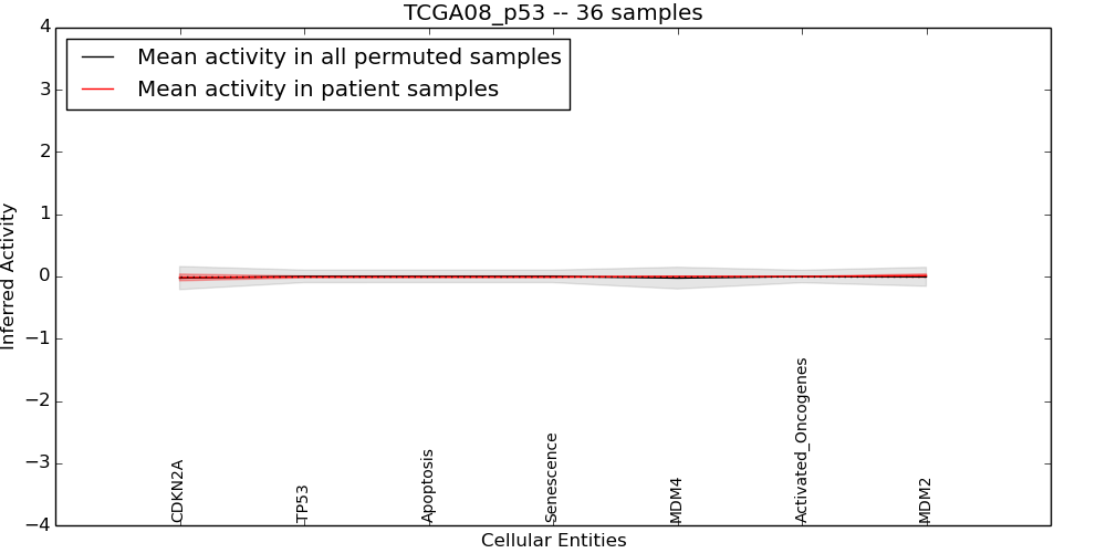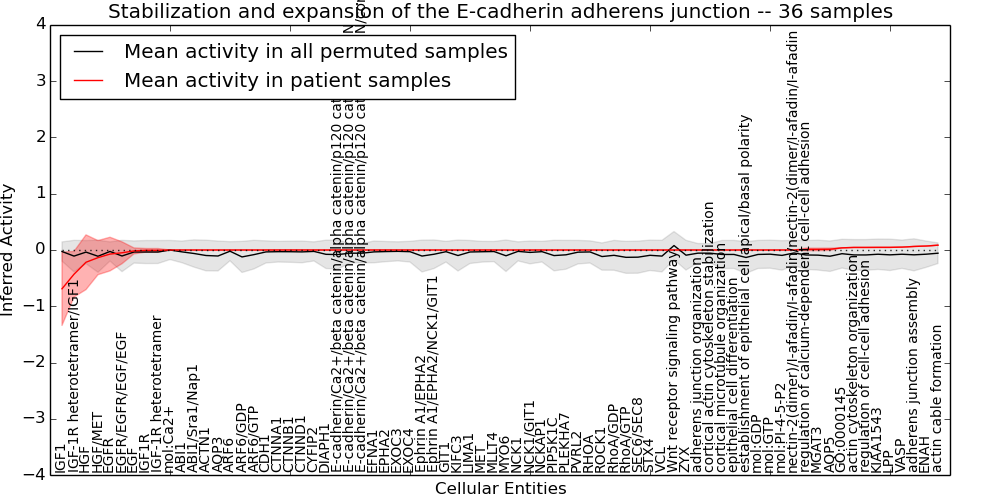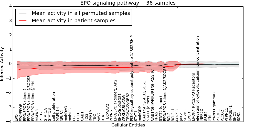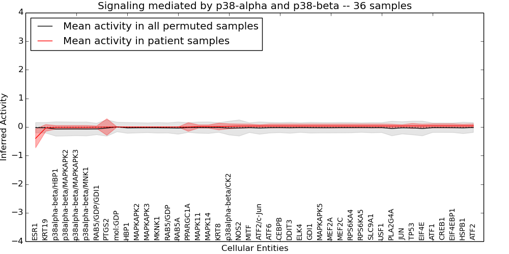 Figure S131. Get High-res Image This plot shows pathway concept perturbations across all samples against a permutation model. The concepts along the x-axis are sorted by lowest to highest mean activity for the real patient samples. Mean inferred activities are plotted along the y-axis as a colored band showing the average level and one standard deviation range. Real samples are shown in red and permuted samples in black.