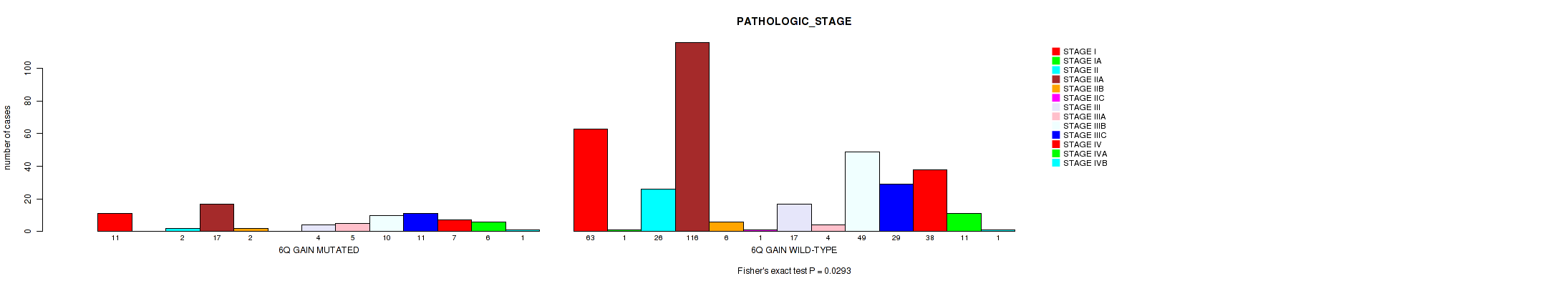 6q gain cnv correlated to 'PATHOLOGIC_STAGE', 'PATHOLOGY_N_STAGE', and 'NUMBER_OF_LYMPH_NODES'.