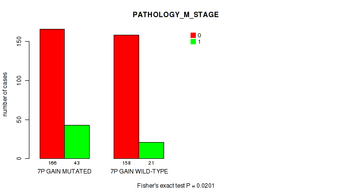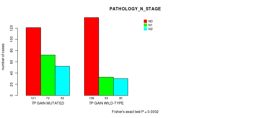 7p gain cnv correlated to 'PATHOLOGIC_STAGE', 'PATHOLOGY_N_STAGE', 'PATHOLOGY_M_STAGE', 'HISTOLOGICAL_TYPE', and 'NUMBER_OF_LYMPH_NODES'.