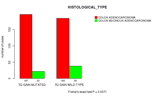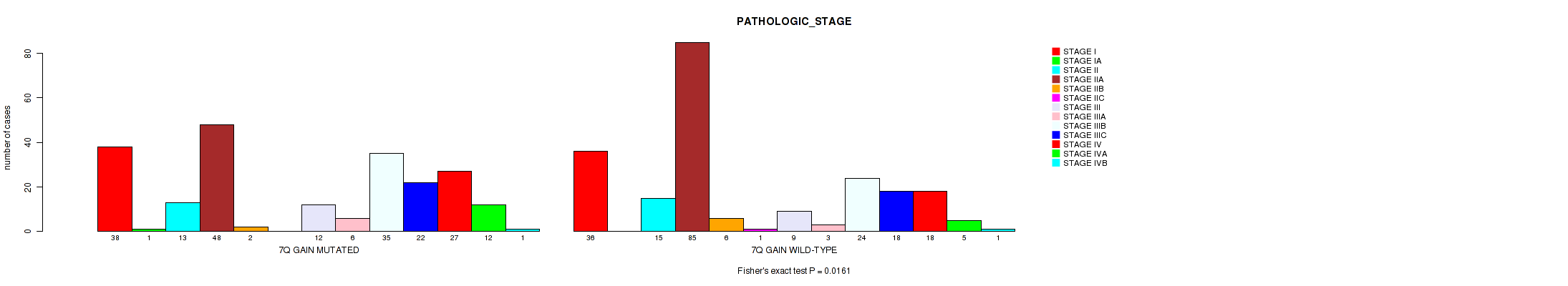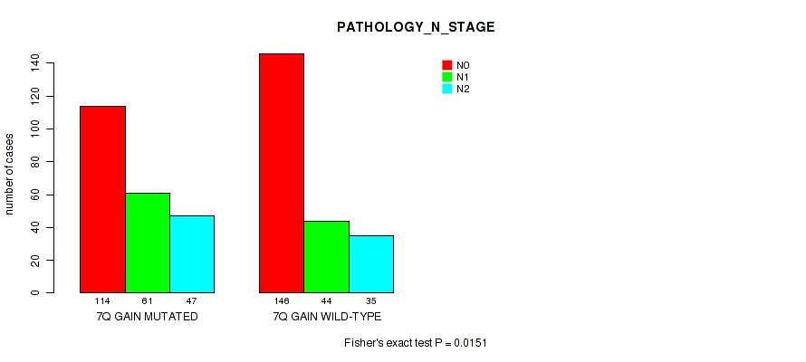 7q gain cnv correlated to 'PATHOLOGIC_STAGE', 'PATHOLOGY_N_STAGE', 'PATHOLOGY_M_STAGE', 'HISTOLOGICAL_TYPE', and 'NUMBER_OF_LYMPH_NODES'.