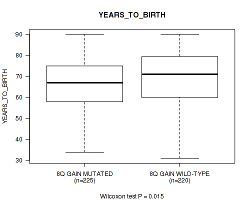 8q gain cnv correlated to 'YEARS_TO_BIRTH' and 'HISTOLOGICAL_TYPE'.