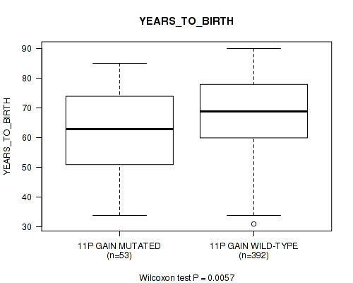 11p gain cnv correlated to 'YEARS_TO_BIRTH', 'PATHOLOGIC_STAGE', 'PATHOLOGY_N_STAGE', 'PATHOLOGY_M_STAGE', 'HISTOLOGICAL_TYPE', and 'NUMBER_OF_LYMPH_NODES'.