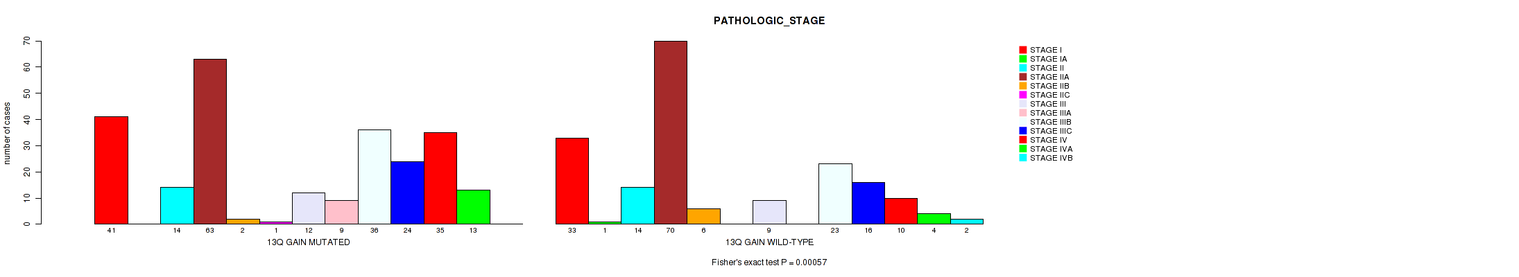 13q gain cnv correlated to 'PATHOLOGIC_STAGE', 'PATHOLOGY_N_STAGE', 'PATHOLOGY_M_STAGE', 'HISTOLOGICAL_TYPE', 'RESIDUAL_TUMOR', and 'NUMBER_OF_LYMPH_NODES'.