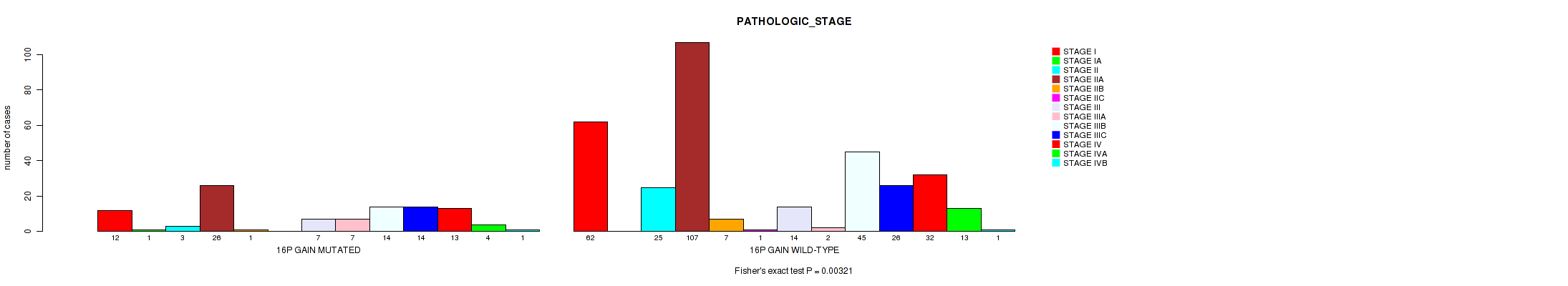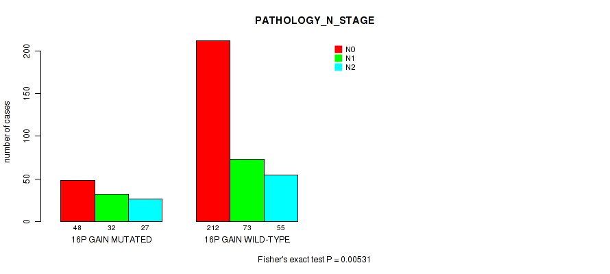 16p gain cnv correlated to 'PATHOLOGIC_STAGE', 'PATHOLOGY_N_STAGE', 'HISTOLOGICAL_TYPE', and 'NUMBER_OF_LYMPH_NODES'.