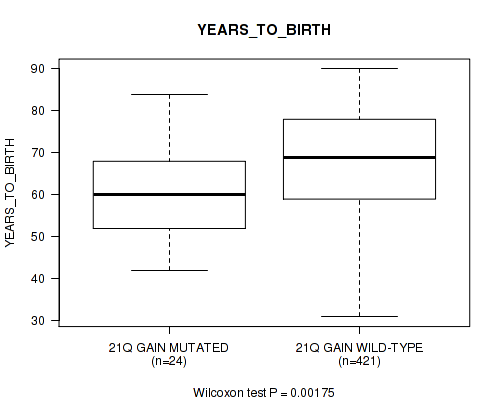 21q gain cnv correlated to 'YEARS_TO_BIRTH'.