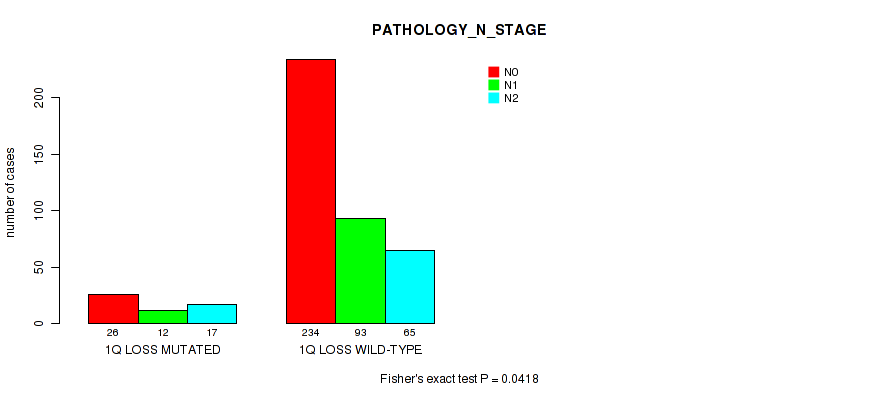 1q loss cnv correlated to 'Time to Death', 'PATHOLOGIC_STAGE', 'PATHOLOGY_N_STAGE', 'PATHOLOGY_M_STAGE', and 'NUMBER_OF_LYMPH_NODES'.