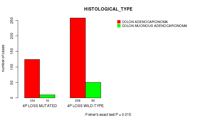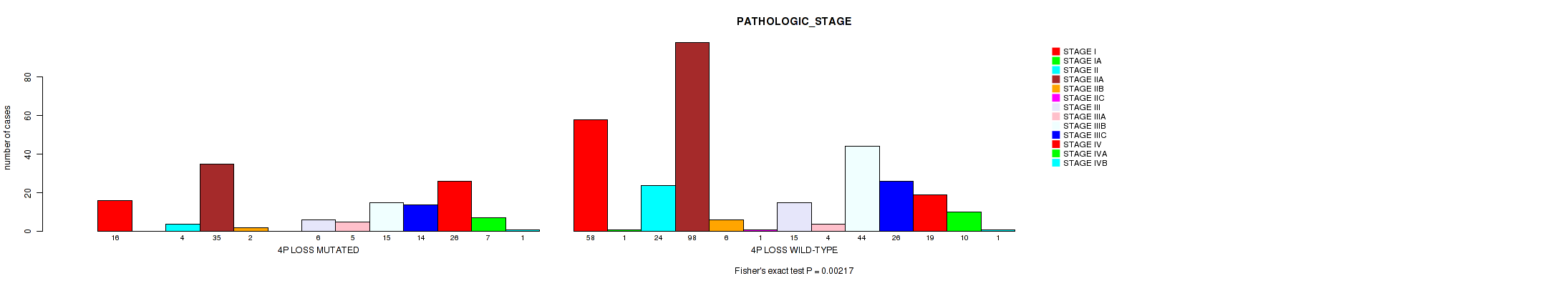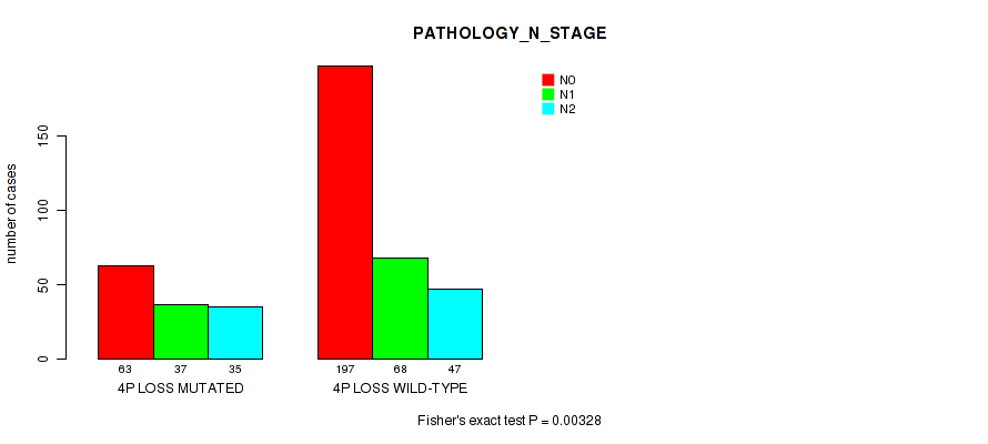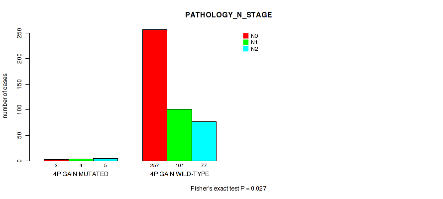 4p loss cnv correlated to 'PATHOLOGIC_STAGE', 'PATHOLOGY_N_STAGE', 'PATHOLOGY_M_STAGE', 'HISTOLOGICAL_TYPE', and 'NUMBER_OF_LYMPH_NODES'.