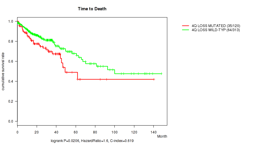 4q loss cnv correlated to 'Time to Death', 'PATHOLOGIC_STAGE', 'PATHOLOGY_N_STAGE', 'PATHOLOGY_M_STAGE', and 'NUMBER_OF_LYMPH_NODES'.