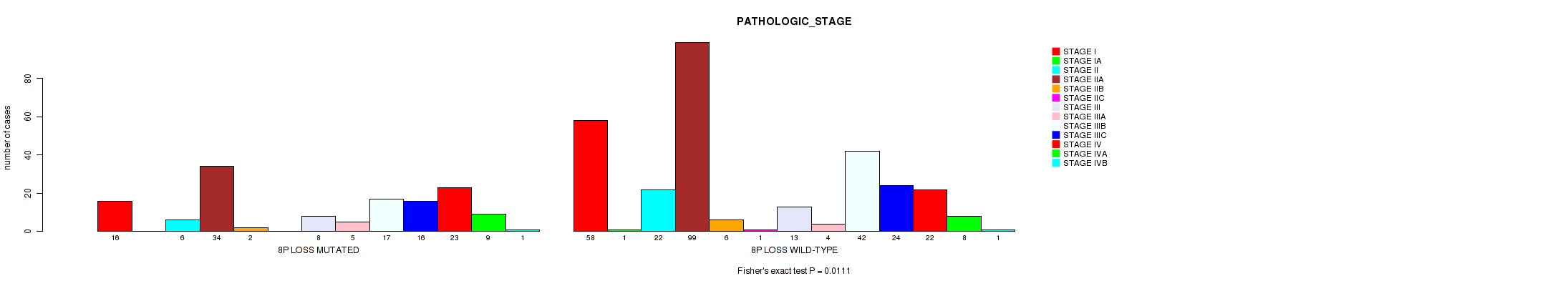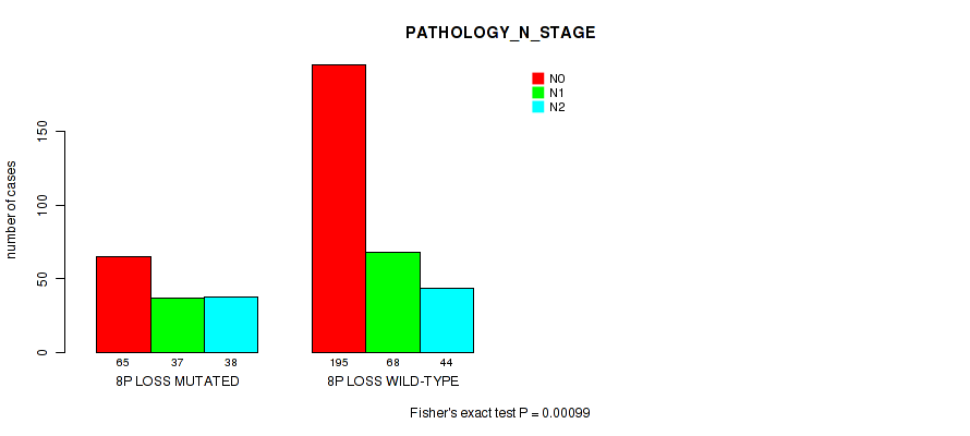 8p loss cnv correlated to 'PATHOLOGIC_STAGE', 'PATHOLOGY_N_STAGE', 'PATHOLOGY_M_STAGE', 'RESIDUAL_TUMOR', and 'NUMBER_OF_LYMPH_NODES'.