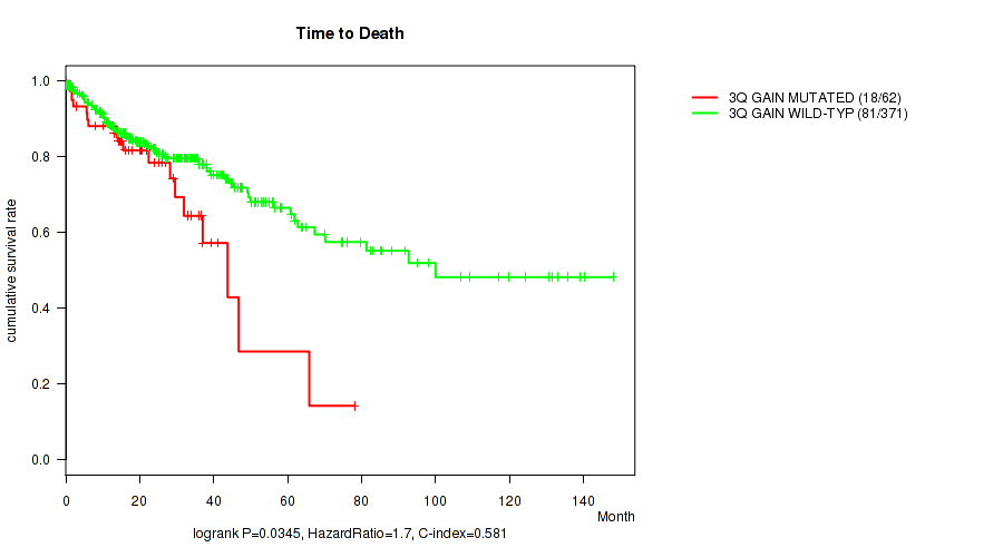 3q gain cnv correlated to 'Time to Death' and 'PATHOLOGIC_STAGE'.