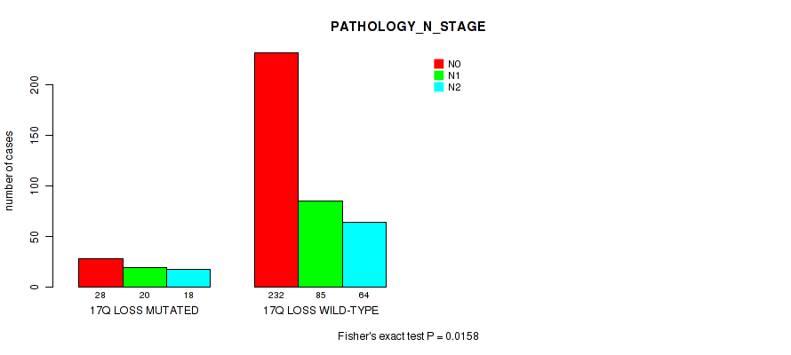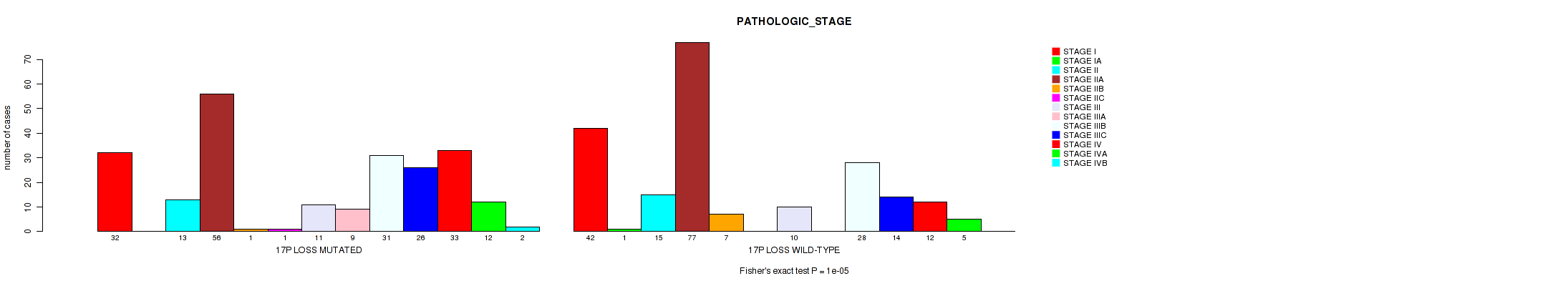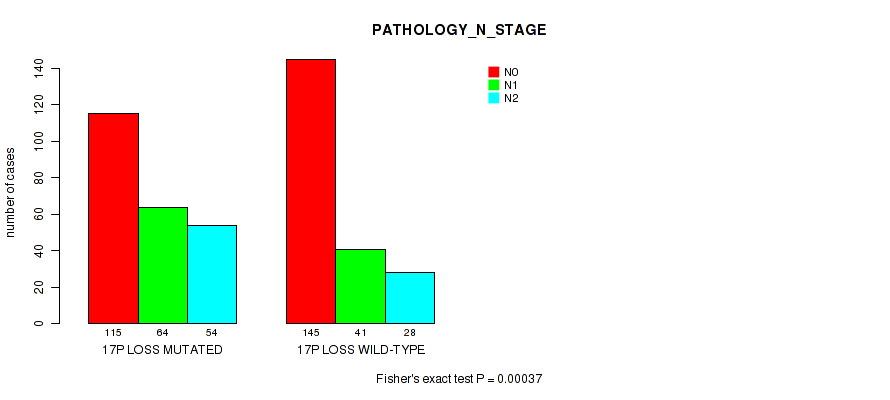 17p loss cnv correlated to 'PATHOLOGIC_STAGE', 'PATHOLOGY_N_STAGE', 'PATHOLOGY_M_STAGE', 'HISTOLOGICAL_TYPE', and 'NUMBER_OF_LYMPH_NODES'.