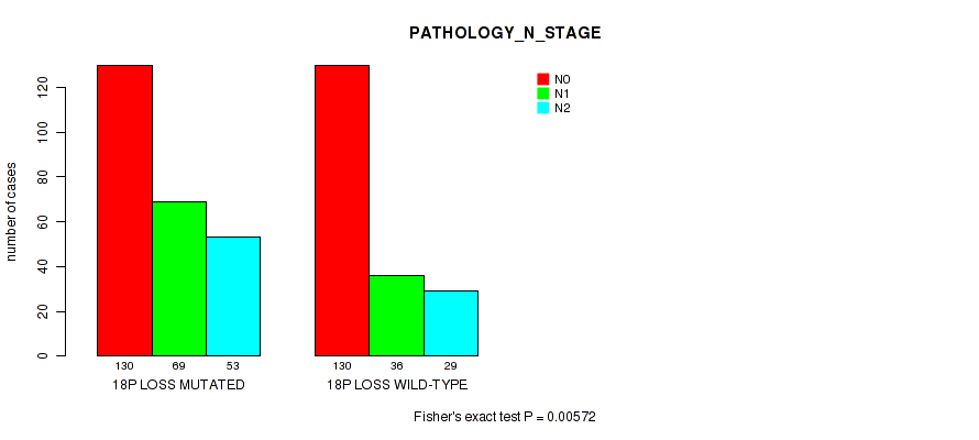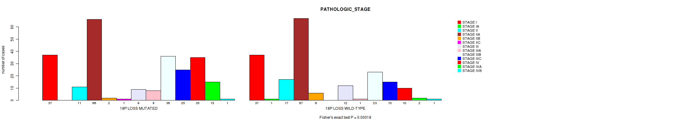 18p loss cnv correlated to 'PATHOLOGIC_STAGE', 'PATHOLOGY_N_STAGE', 'PATHOLOGY_M_STAGE', 'HISTOLOGICAL_TYPE', and 'NUMBER_OF_LYMPH_NODES'.