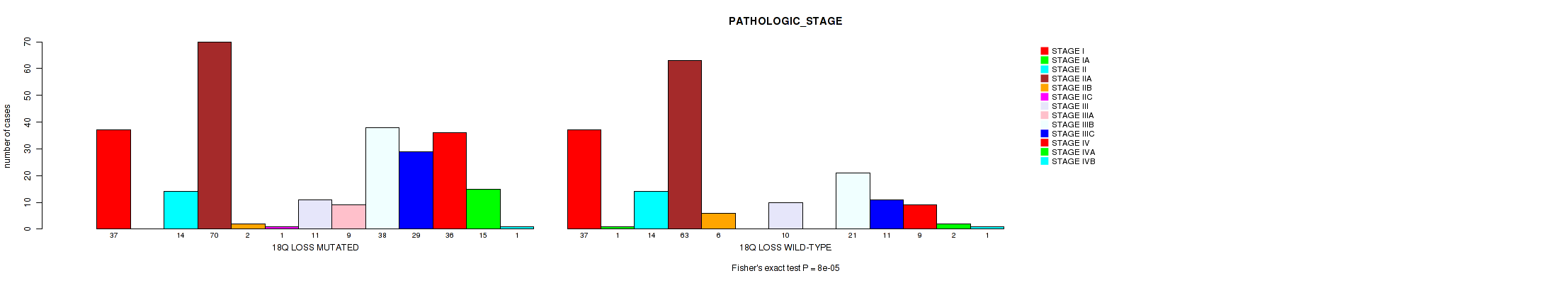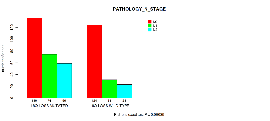 18q loss cnv correlated to 'YEARS_TO_BIRTH', 'PATHOLOGIC_STAGE', 'PATHOLOGY_N_STAGE', 'PATHOLOGY_M_STAGE', 'HISTOLOGICAL_TYPE', and 'NUMBER_OF_LYMPH_NODES'.