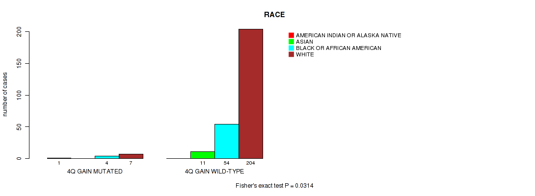 4q gain cnv correlated to 'PATHOLOGY_N_STAGE', 'NUMBER_OF_LYMPH_NODES', and 'RACE'.