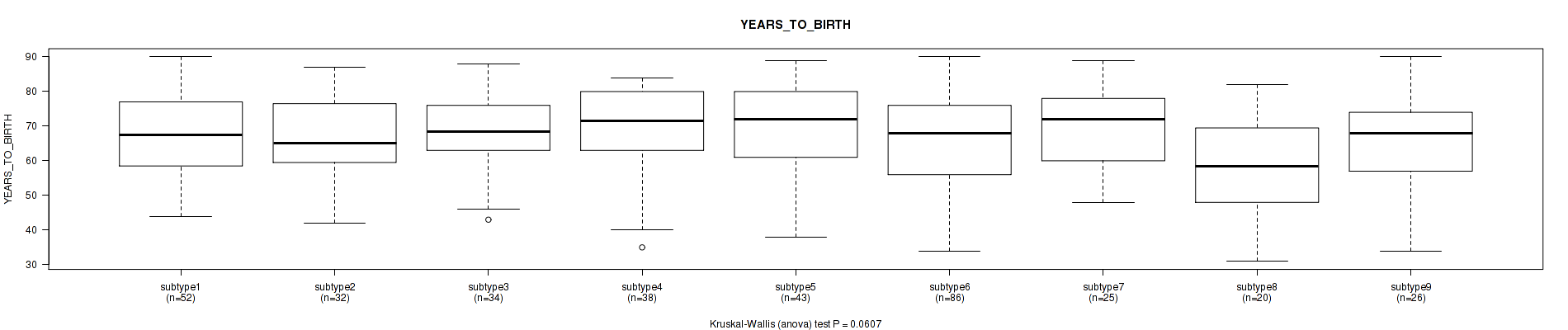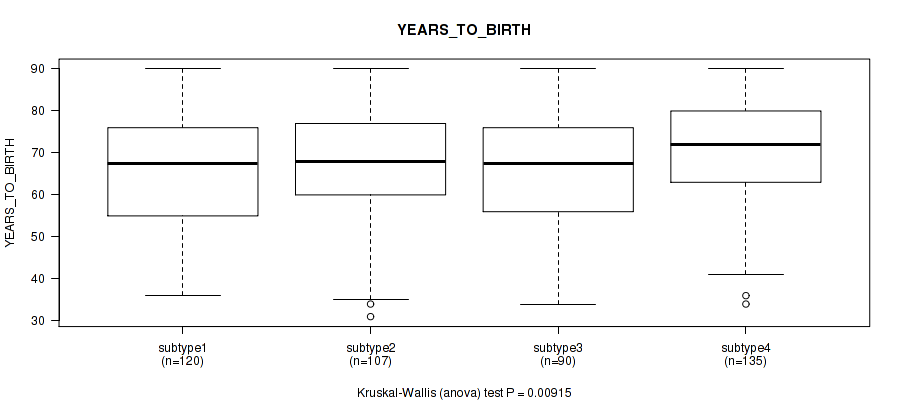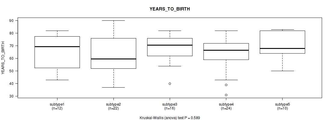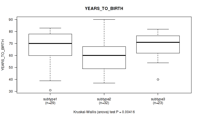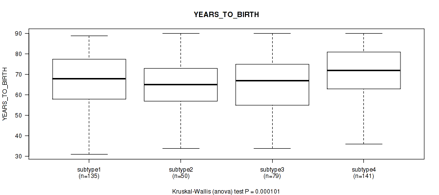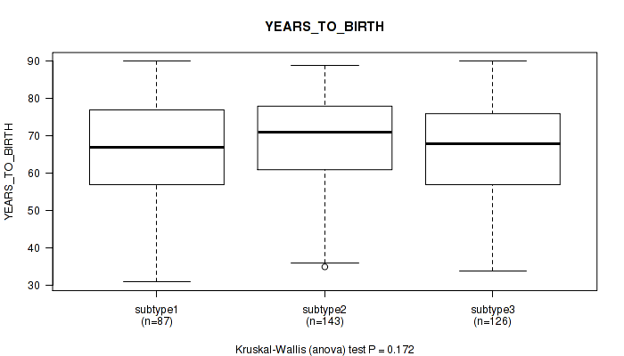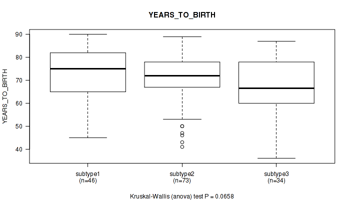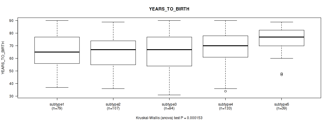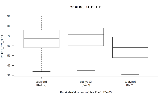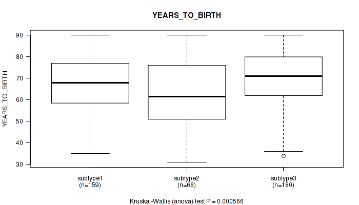 | YEARS TO BIRTH | Kruskal-Wallis (anova) |