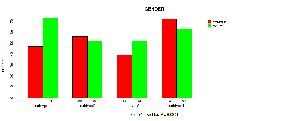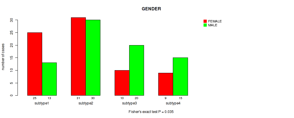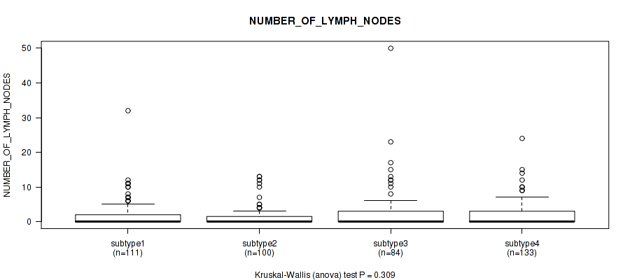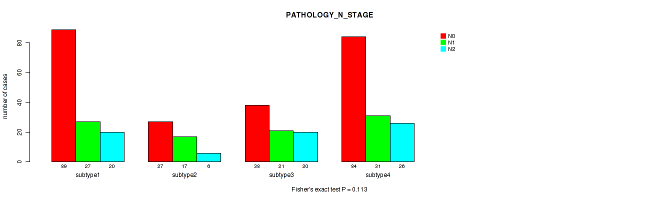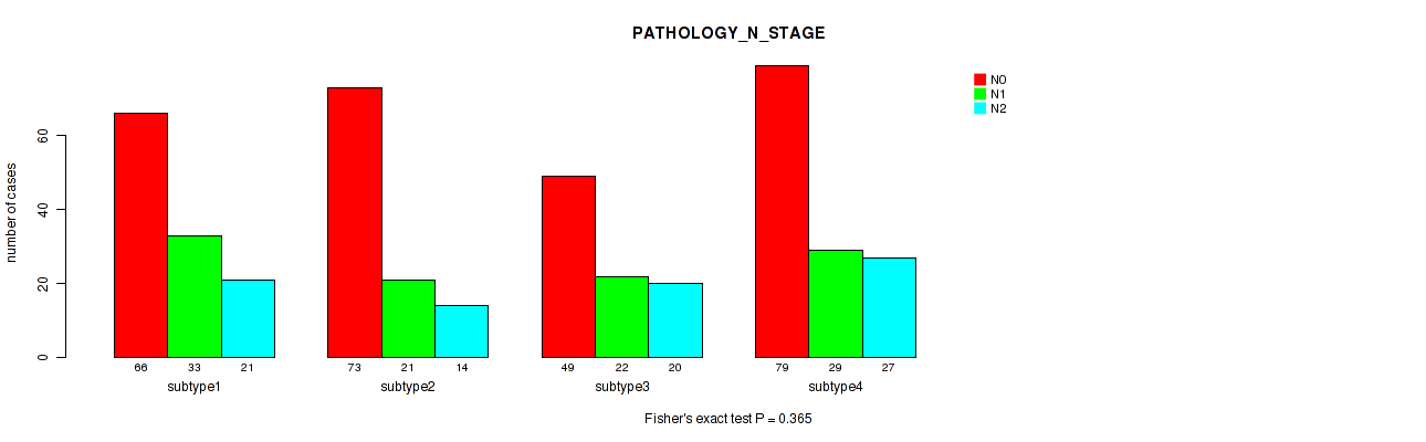CNMF clustering analysis on array-based mRNA expression data identified 4 subtypes that correlate to 'PATHOLOGIC_STAGE', 'PATHOLOGY_N_STAGE', 'GENDER', 'HISTOLOGICAL_TYPE', and 'NUMBER_OF_LYMPH_NODES'.