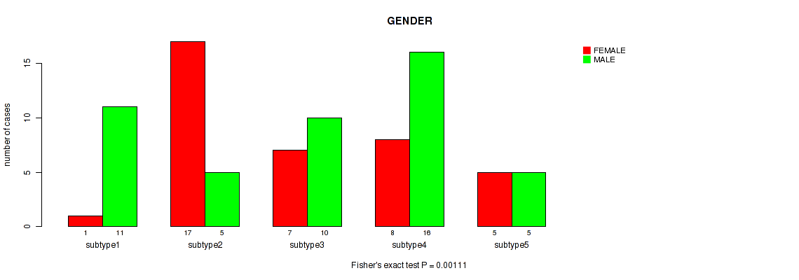 5 subtypes identified in current cancer cohort by 'MIRseq Mature cHierClus subtypes'. These subtypes correlate to 'GENDER' and 'NUMBER_OF_LYMPH_NODES'.