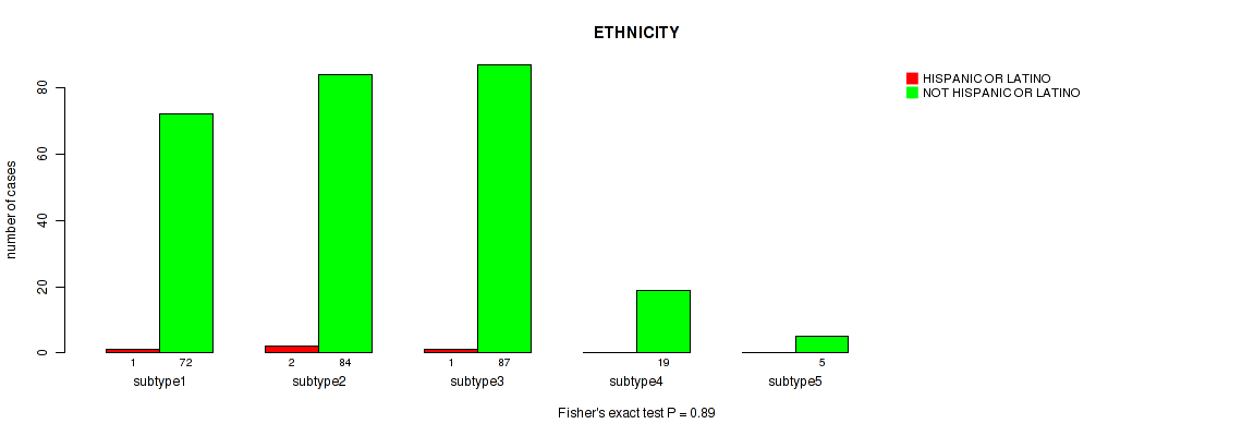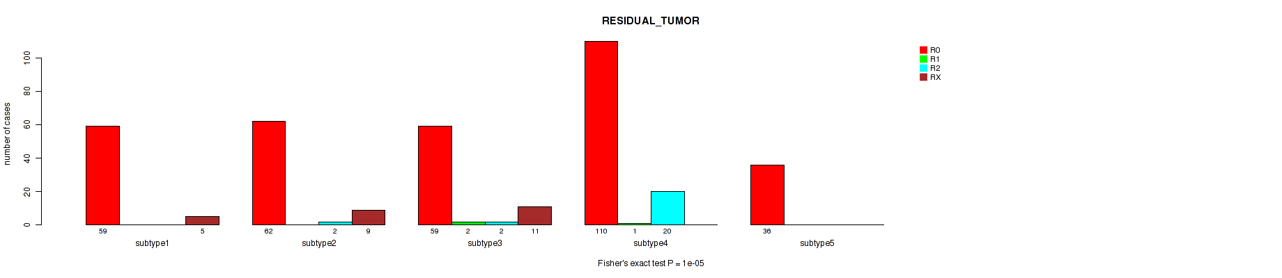 Consensus hierarchical clustering analysis on sequencing-based mRNA expression data identified 5 subtypes that correlate to 'YEARS_TO_BIRTH', 'PATHOLOGIC_STAGE', 'PATHOLOGY_M_STAGE', 'HISTOLOGICAL_TYPE', and 'RESIDUAL_TUMOR'.