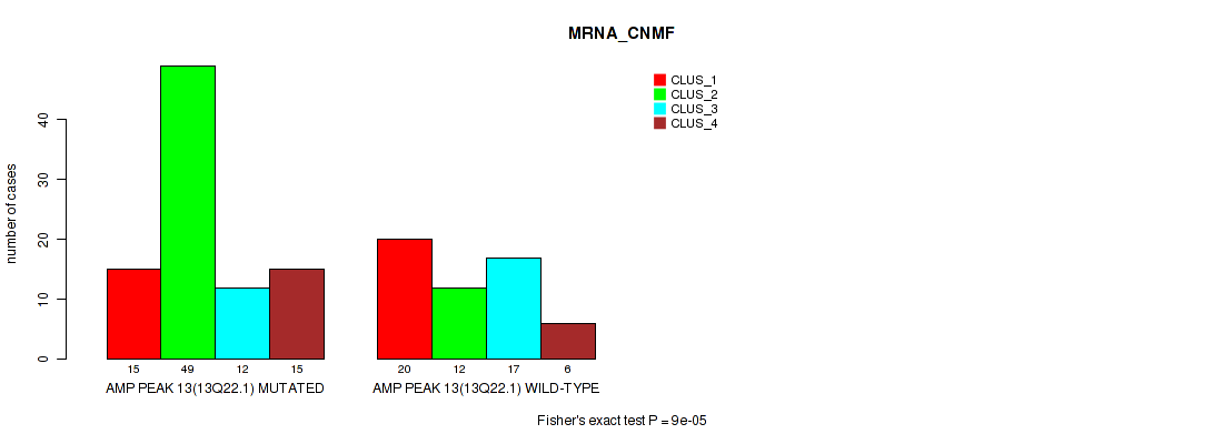 amp_13q22.1 cnv correlated to 'MRNA_CNMF', 'MRNA_CHIERARCHICAL', 'CN_CNMF', 'METHLYATION_CNMF', 'MRNASEQ_CNMF', and 'MRNASEQ_CHIERARCHICAL'.