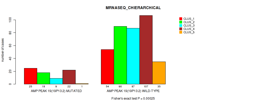 amp_19p13.2 cnv correlated to 'CN_CNMF', 'METHLYATION_CNMF', 'MRNASEQ_CHIERARCHICAL', and 'MIRSEQ_MATURE_CHIERARCHICAL'.