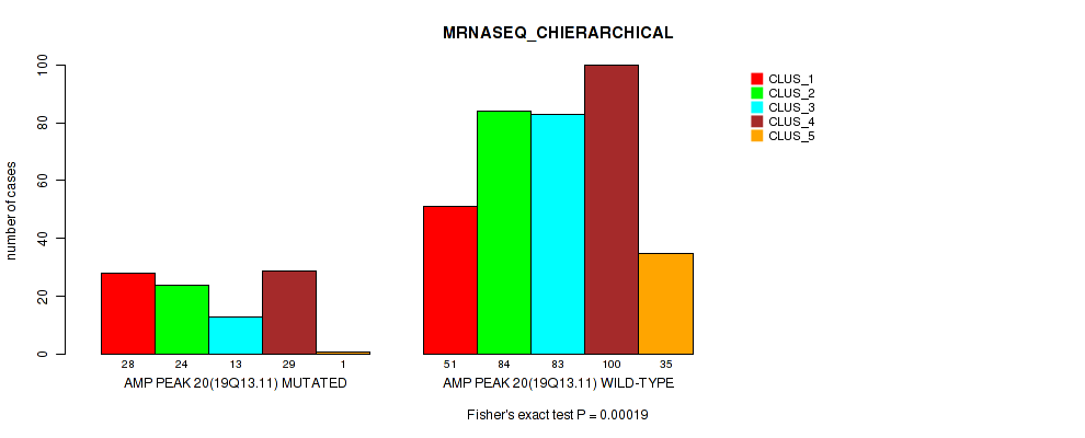 amp_19q13.11 cnv correlated to 'MRNA_CHIERARCHICAL', 'CN_CNMF', 'RPPA_CNMF', 'MRNASEQ_CHIERARCHICAL', 'MIRSEQ_MATURE_CNMF', and 'MIRSEQ_MATURE_CHIERARCHICAL'.