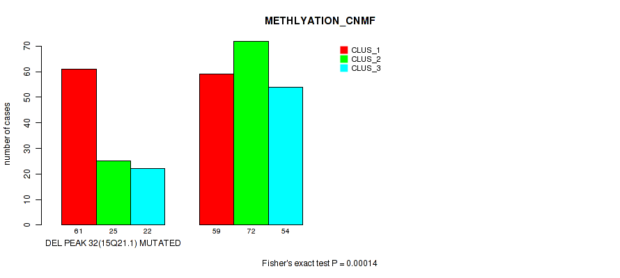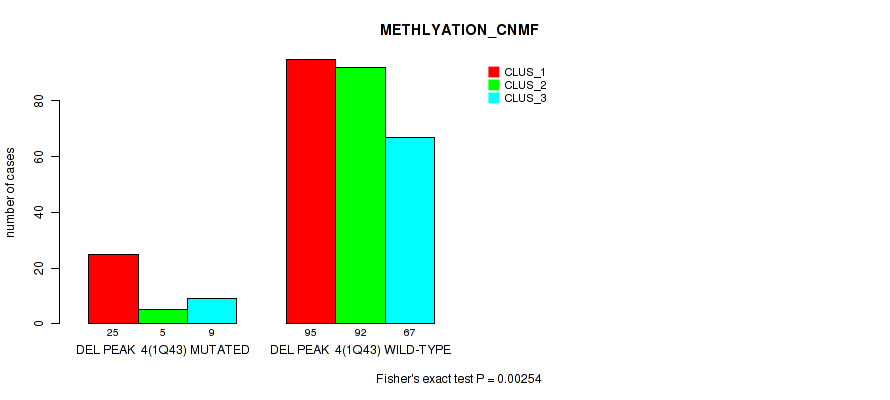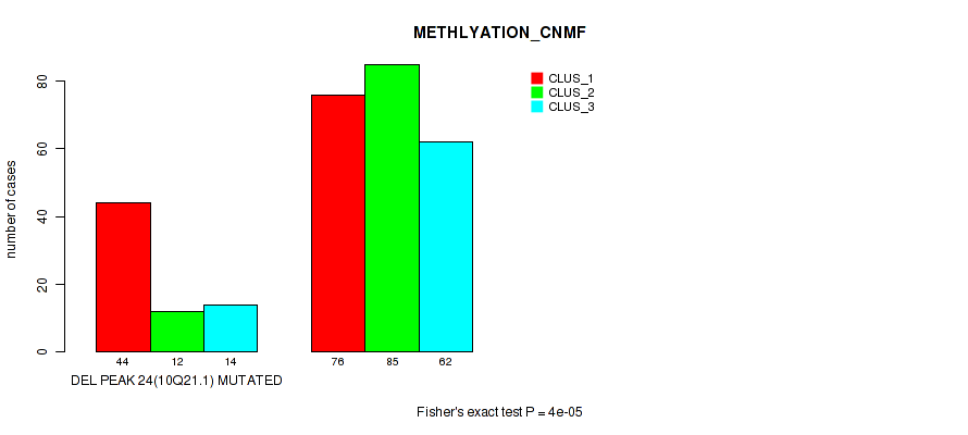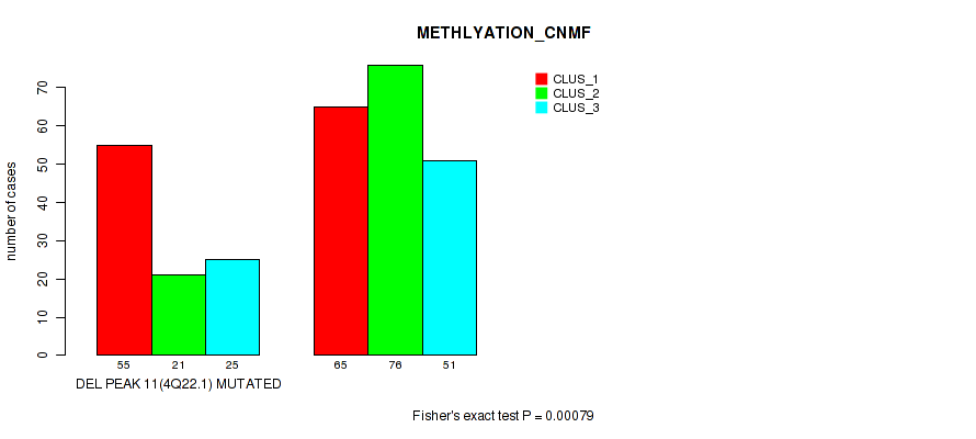Table S357. Gene #68: 'del_21q11.2' versus Molecular Subtype #4: 'METHLYATION_CNMF'