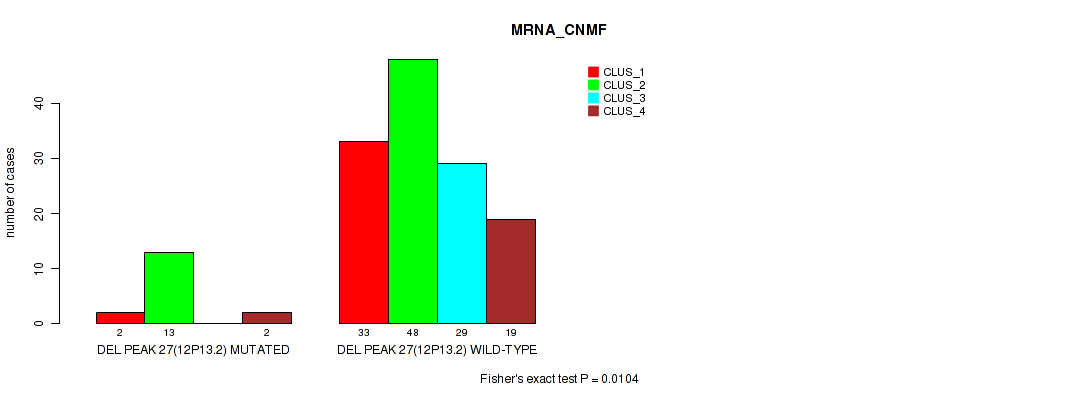 del_12p13.2 cnv correlated to 'MRNA_CNMF', 'MRNA_CHIERARCHICAL', 'CN_CNMF', 'METHLYATION_CNMF', 'MRNASEQ_CNMF', 'MRNASEQ_CHIERARCHICAL', and 'MIRSEQ_MATURE_CHIERARCHICAL'.