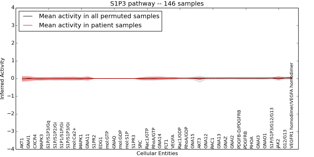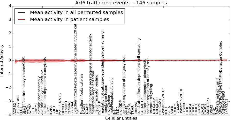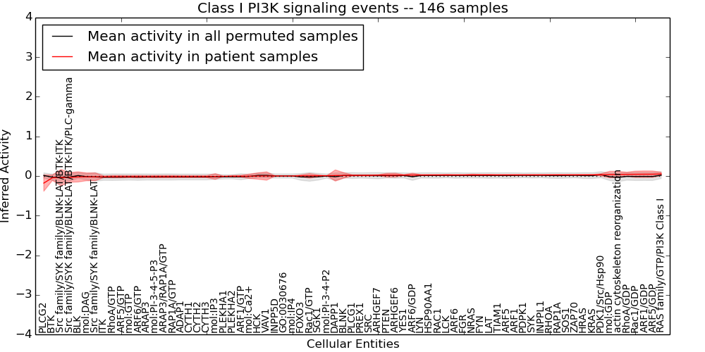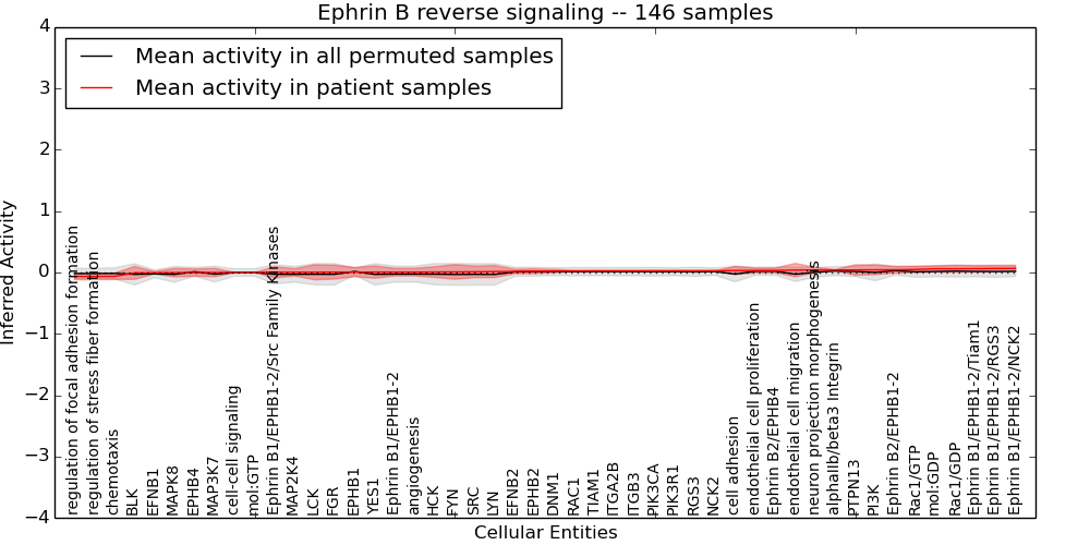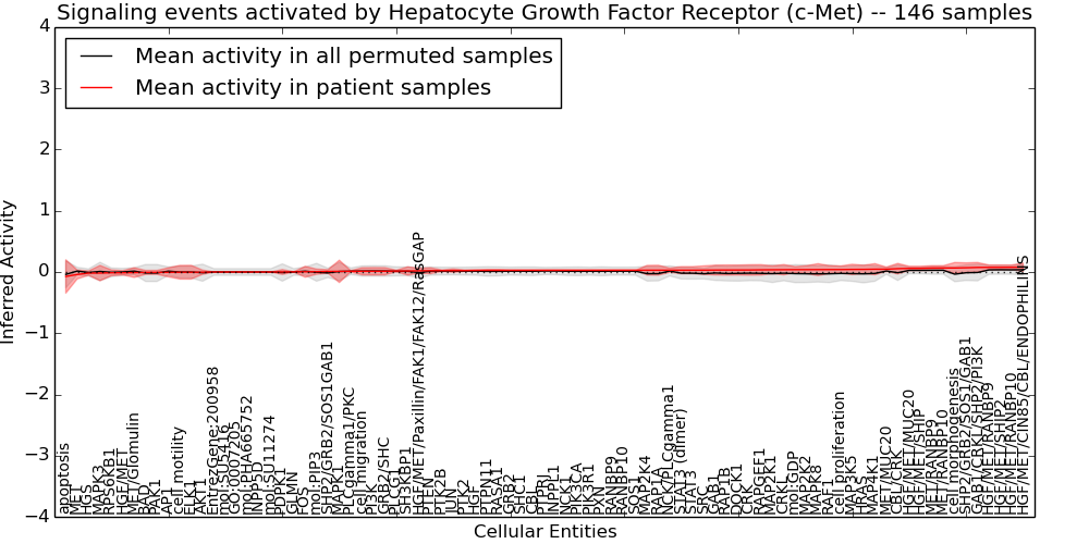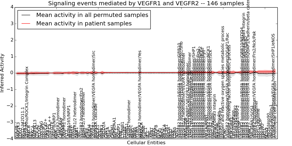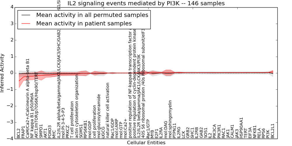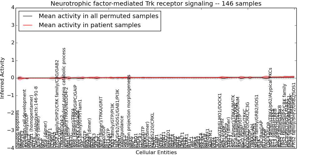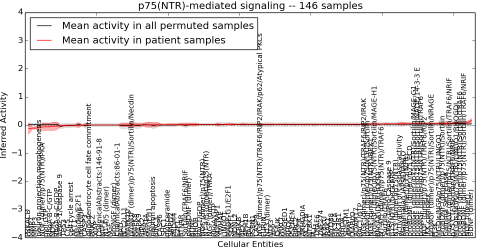 Figure S131. Get High-res Image This plot shows pathway concept perturbations across all samples against a permutation model. The concepts along the x-axis are sorted by lowest to highest mean activity for the real patient samples. Mean inferred activities are plotted along the y-axis as a colored band showing the average level and one standard deviation range. Real samples are shown in red and permuted samples in black.