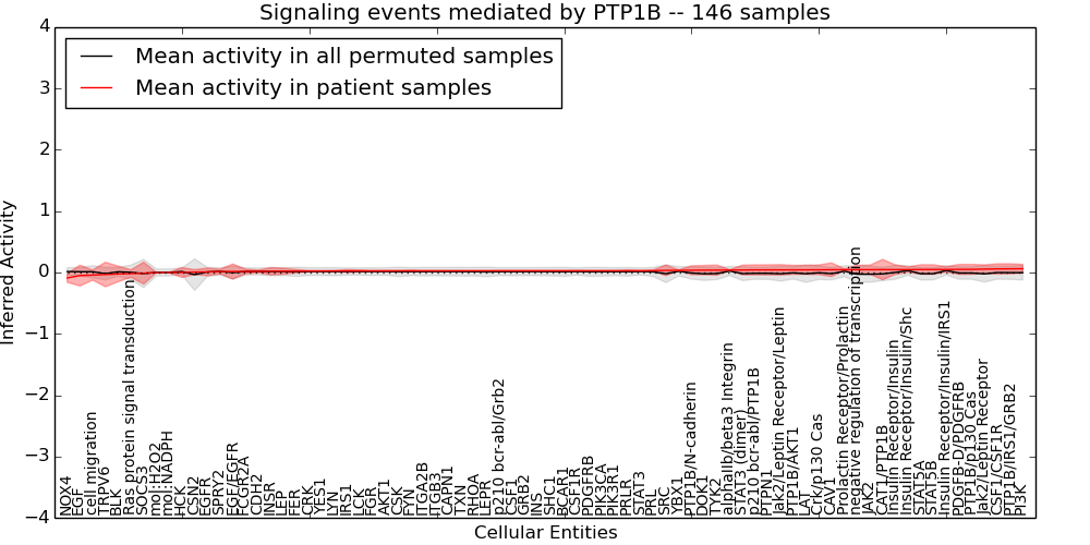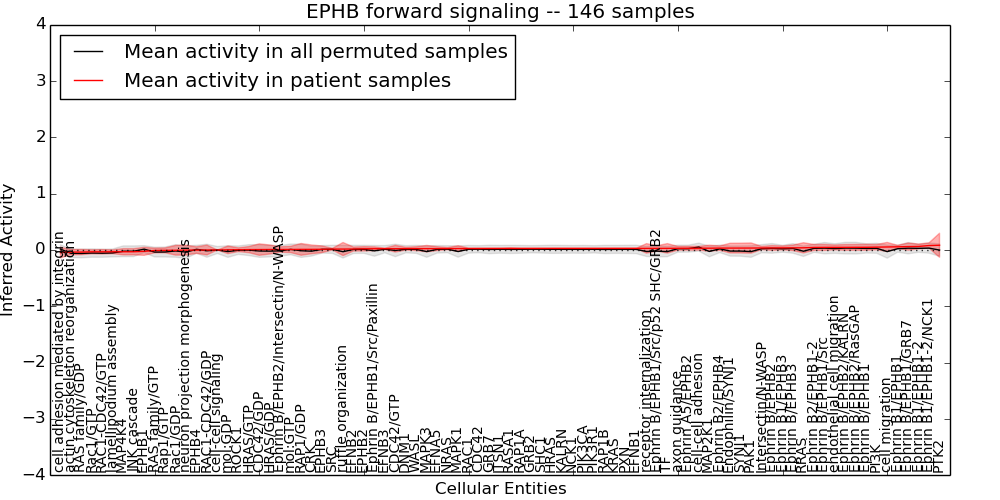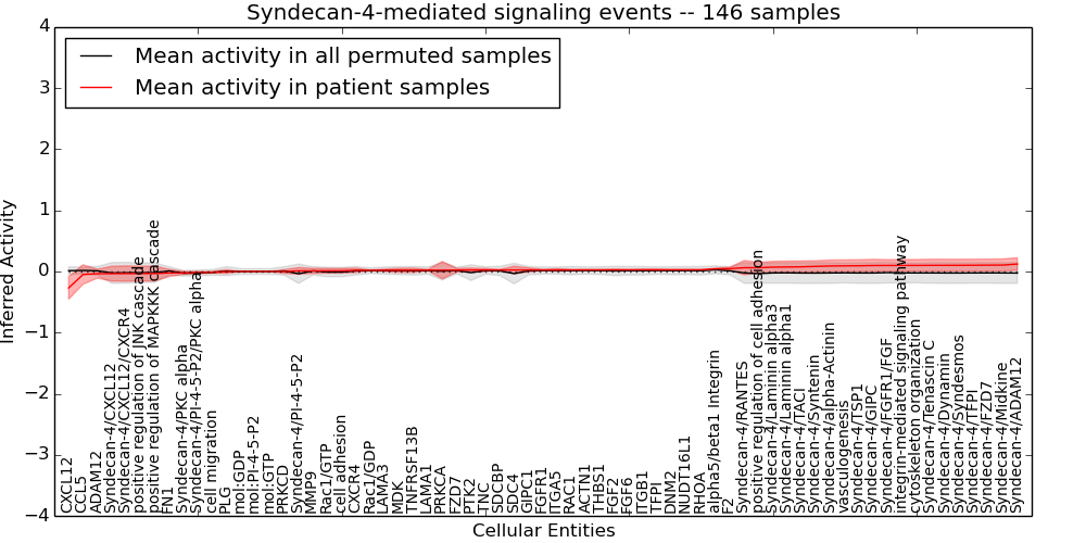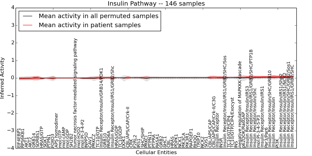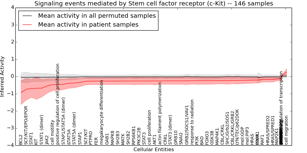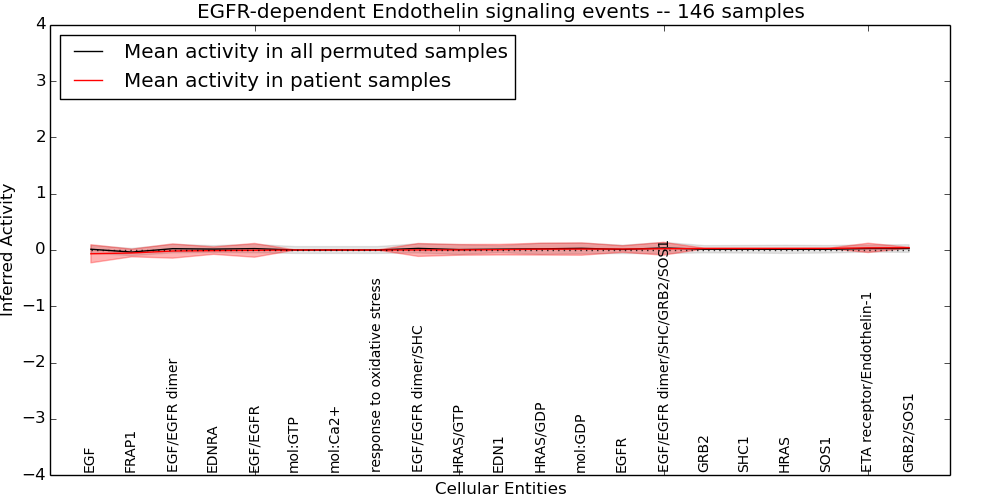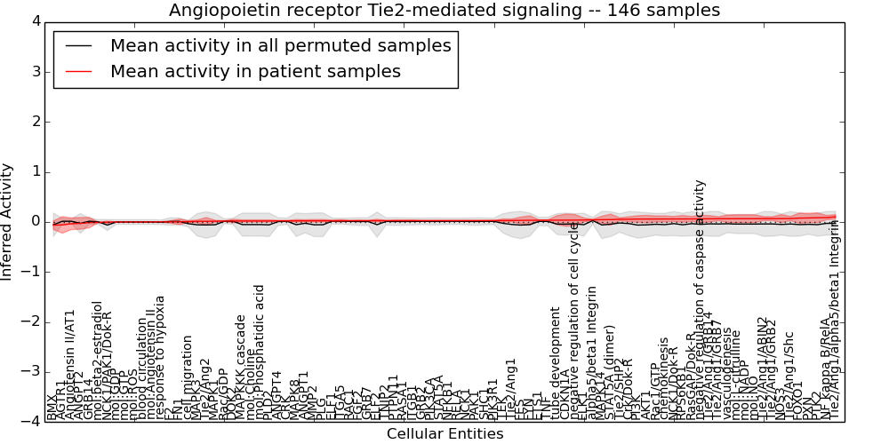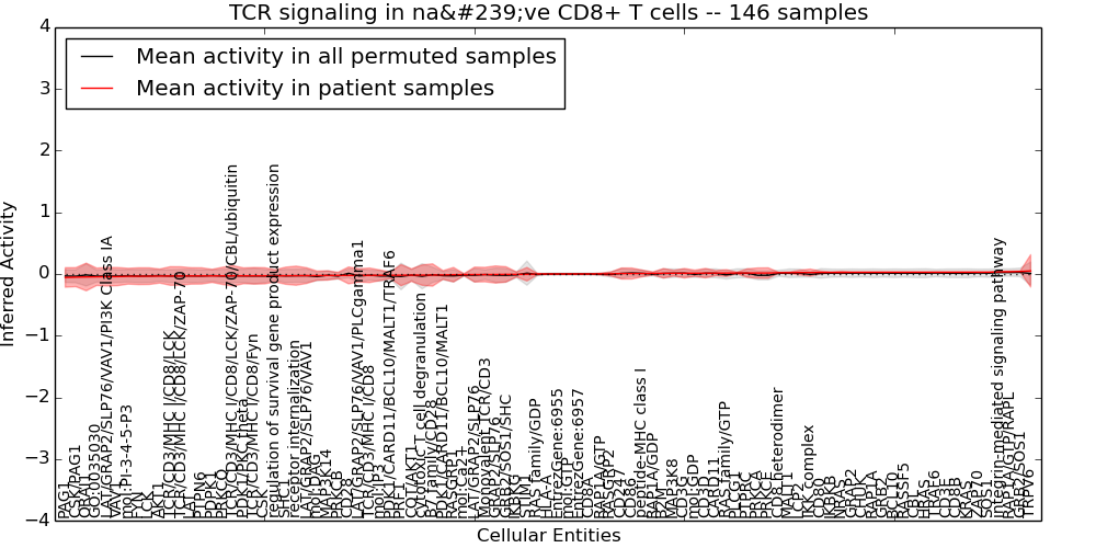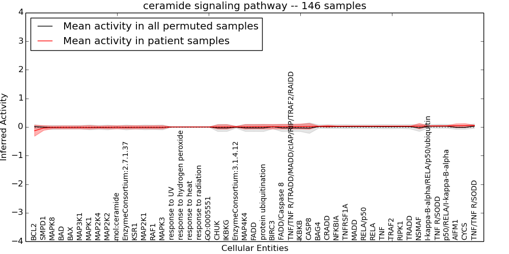 Figure S131. Get High-res Image This plot shows pathway concept perturbations across all samples against a permutation model. The concepts along the x-axis are sorted by lowest to highest mean activity for the real patient samples. Mean inferred activities are plotted along the y-axis as a colored band showing the average level and one standard deviation range. Real samples are shown in red and permuted samples in black.