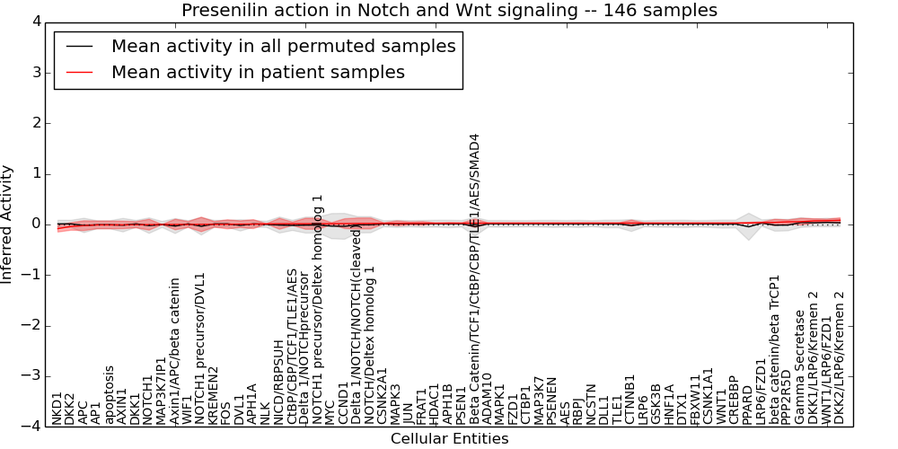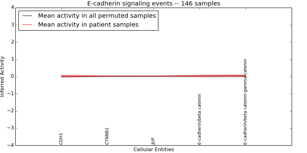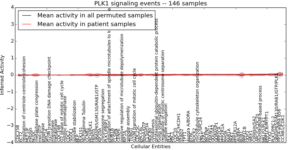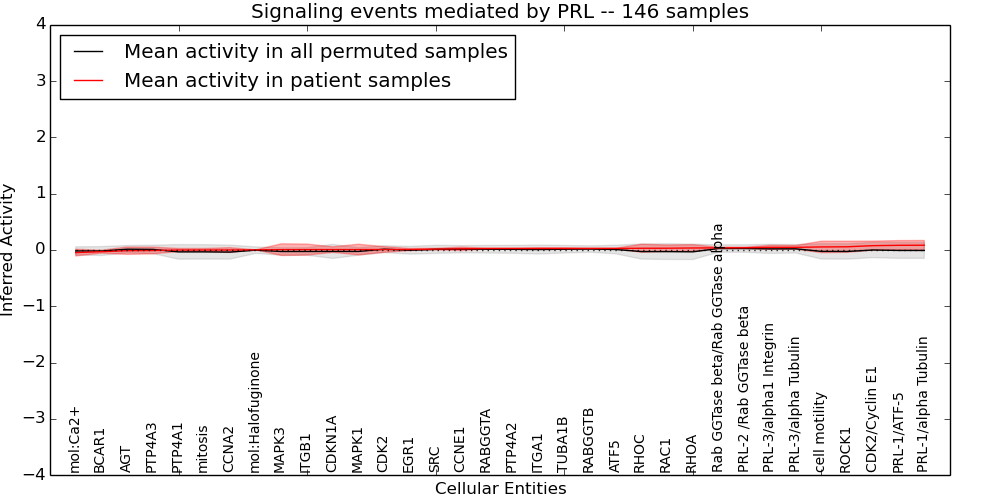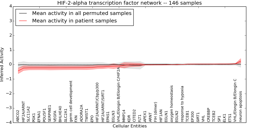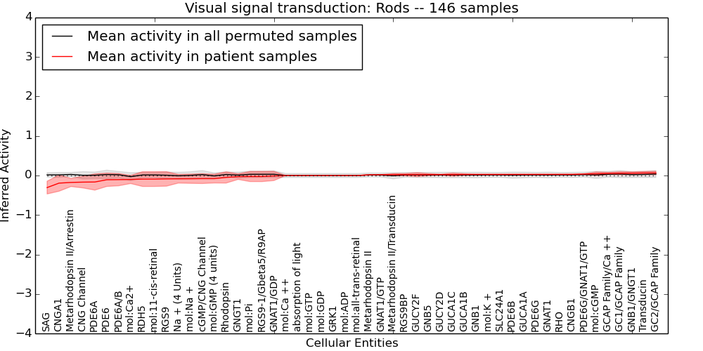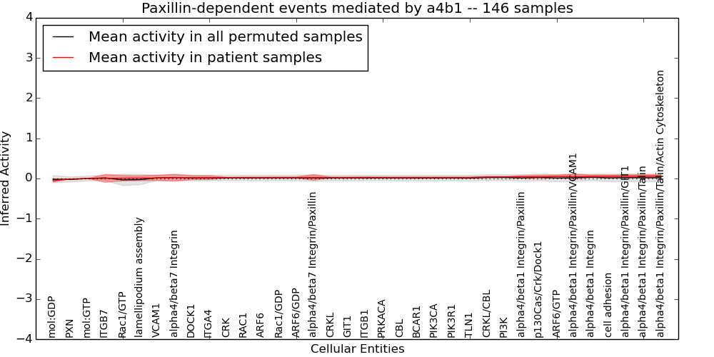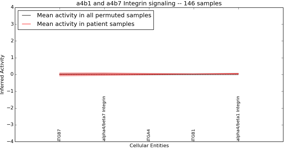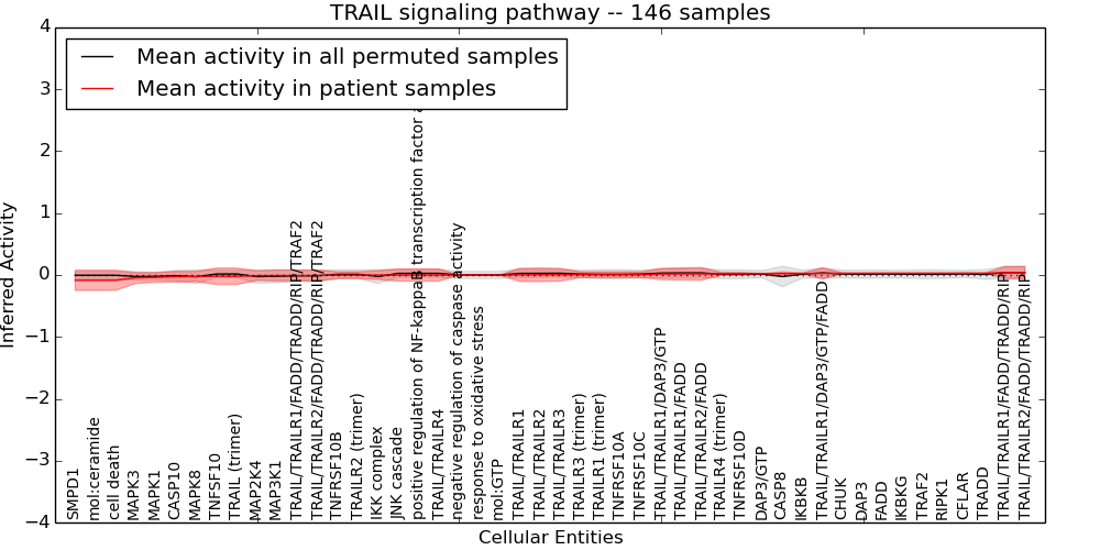 Figure S131. Get High-res Image This plot shows pathway concept perturbations across all samples against a permutation model. The concepts along the x-axis are sorted by lowest to highest mean activity for the real patient samples. Mean inferred activities are plotted along the y-axis as a colored band showing the average level and one standard deviation range. Real samples are shown in red and permuted samples in black.