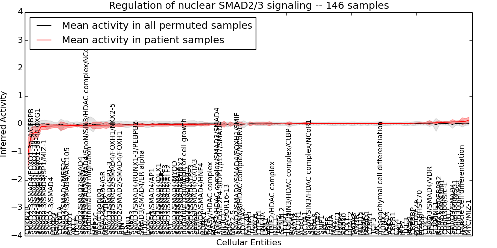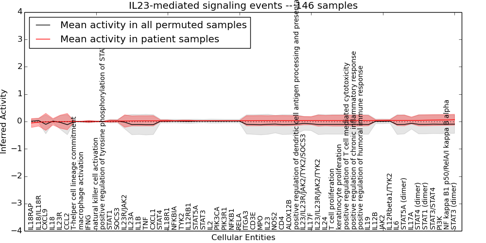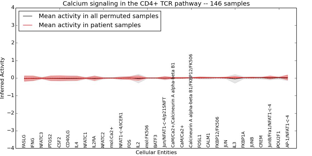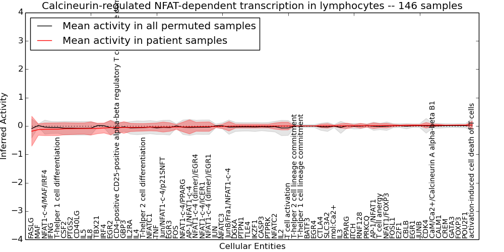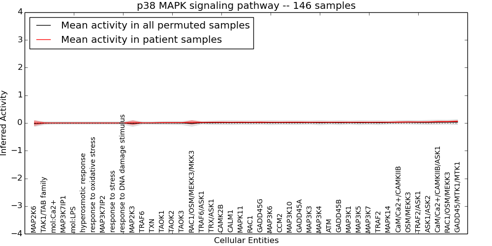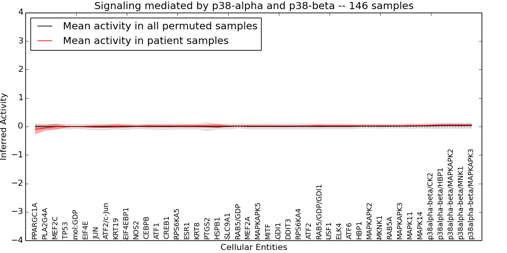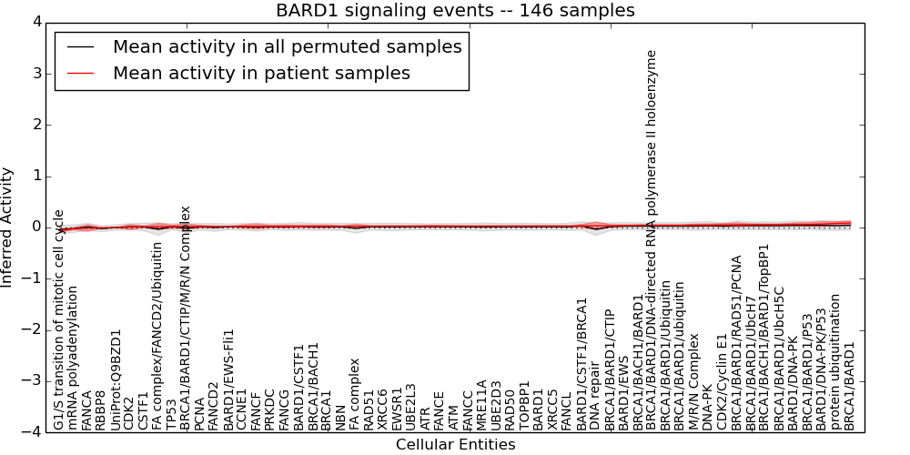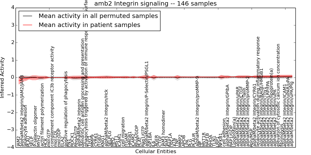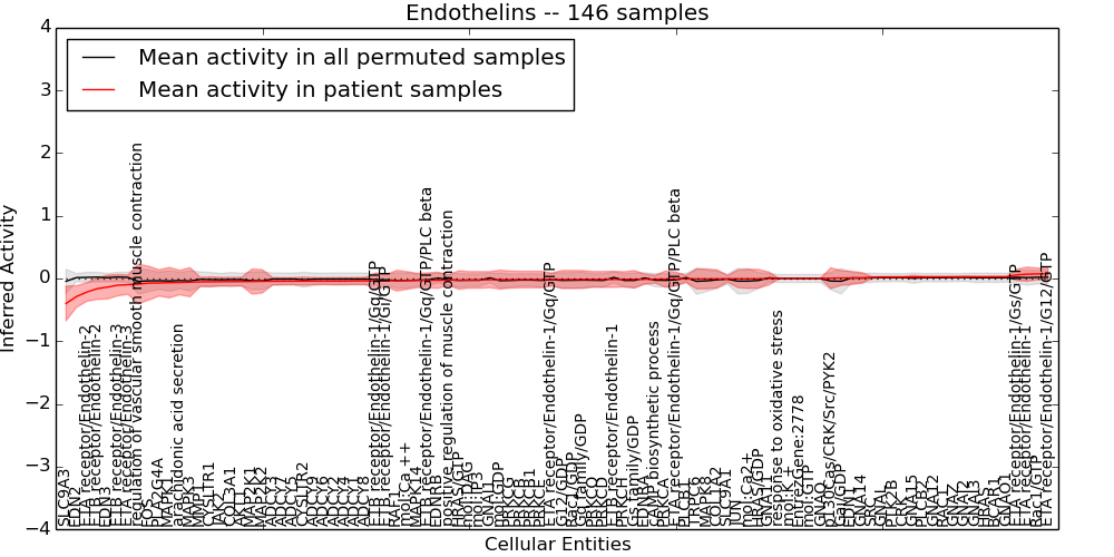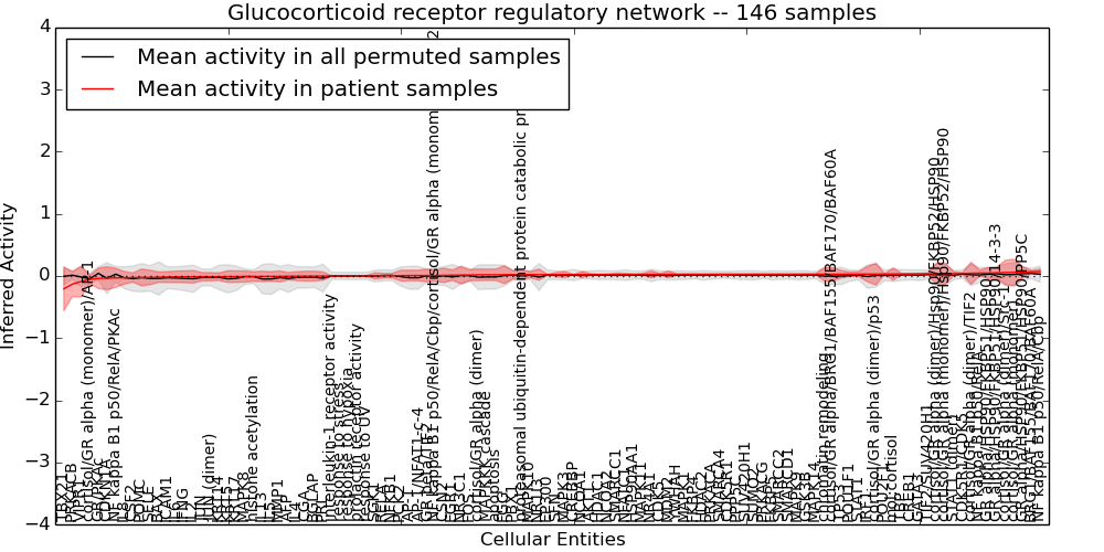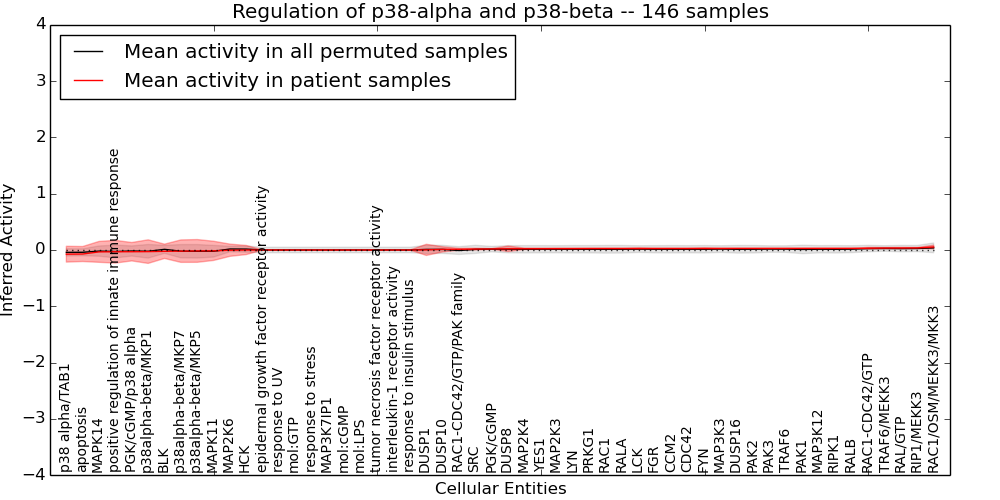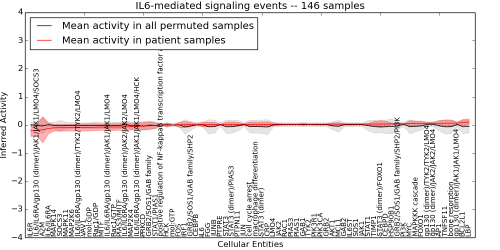 Figure S128. Get High-res Image This plot shows pathway concept perturbations across all samples against a permutation model. The concepts along the x-axis are sorted by lowest to highest mean activity for the real patient samples. Mean inferred activities are plotted along the y-axis as a colored band showing the average level and one standard deviation range. Real samples are shown in red and permuted samples in black.