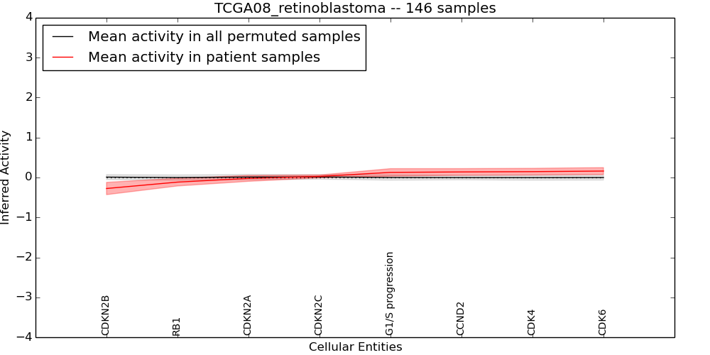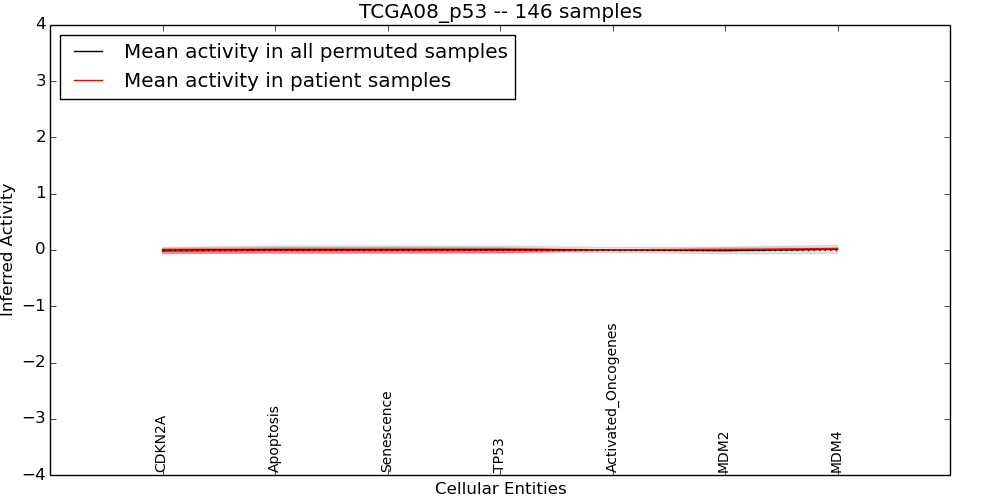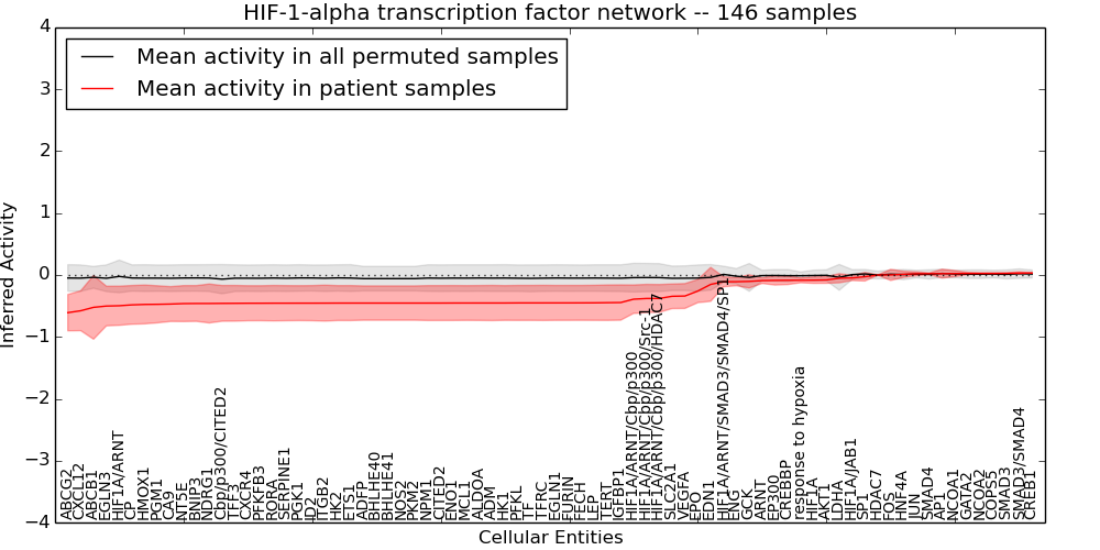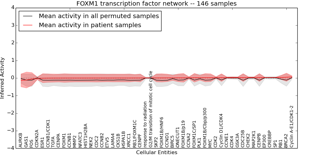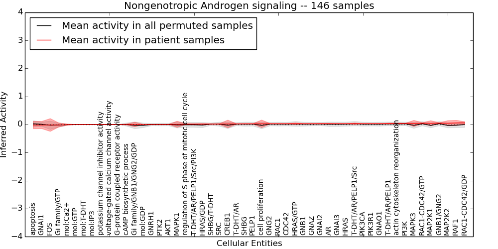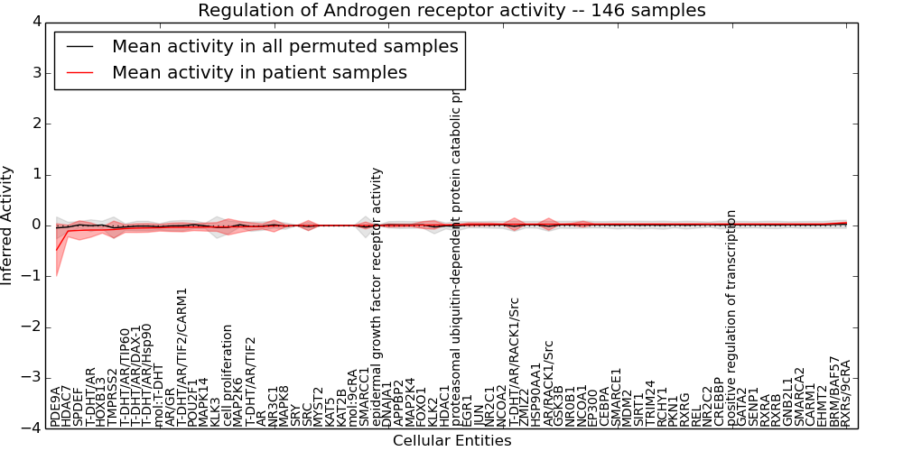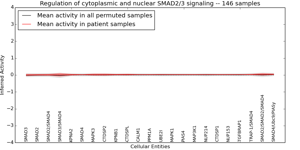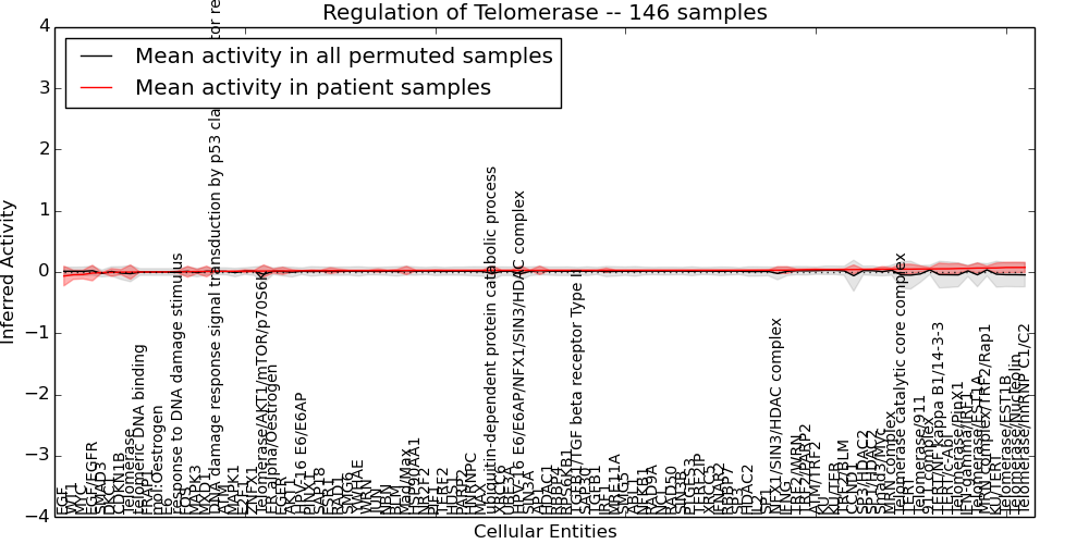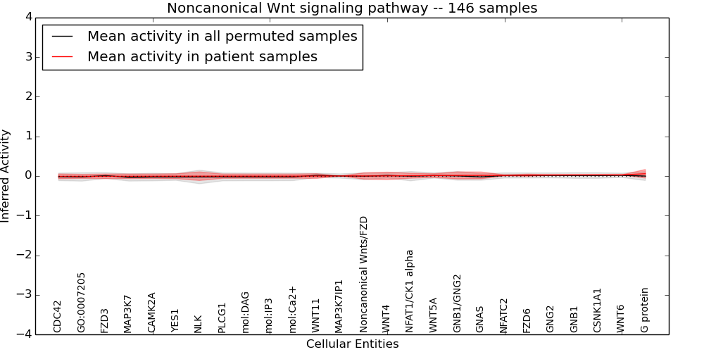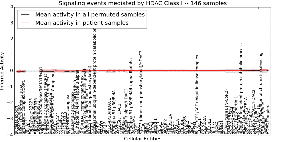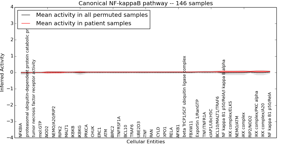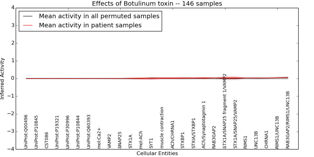 Figure S128. Get High-res Image This plot shows pathway concept perturbations across all samples against a permutation model. The concepts along the x-axis are sorted by lowest to highest mean activity for the real patient samples. Mean inferred activities are plotted along the y-axis as a colored band showing the average level and one standard deviation range. Real samples are shown in red and permuted samples in black.