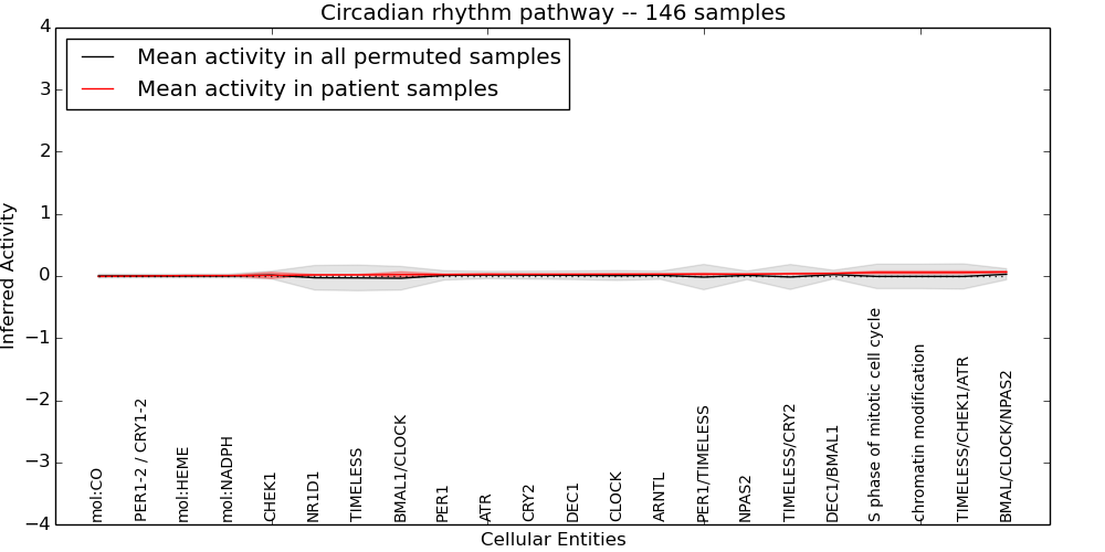 Figure S130. Get High-res Image This plot shows pathway concept perturbations across all samples against a permutation model. The concepts along the x-axis are sorted by lowest to highest mean activity for the real patient samples. Mean inferred activities are plotted along the y-axis as a colored band showing the average level and one standard deviation range. Real samples are shown in red and permuted samples in black.