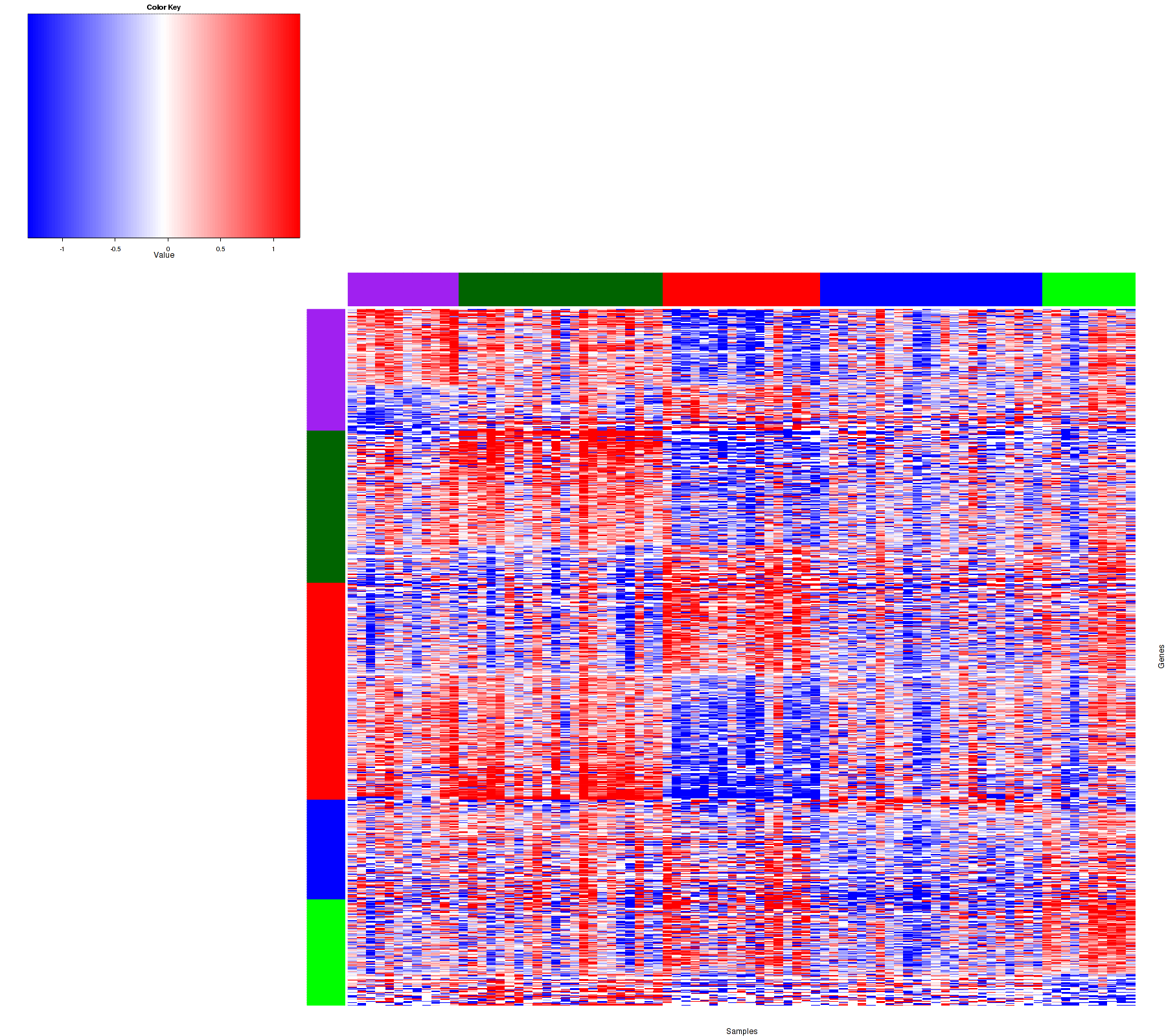 Figure 1. Get High-res Image Samples were separated into 5 clusters. Shown are 85 samples and 805 marker miRs. The color bar of the row indicates the marker miRs for the corresponding cluster.