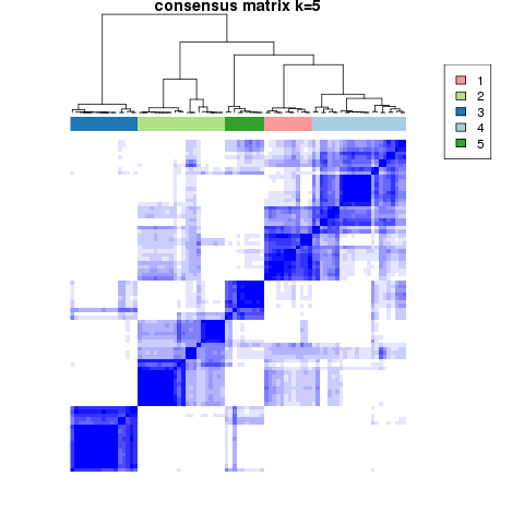 Figure 4. Get High-res Image The consensus matrix after clustering shows 5 clusters with limited overlap between clusters.