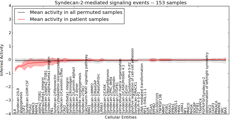 Figure S131. Get High-res Image This plot shows pathway concept perturbations across all samples against a permutation model. The concepts along the x-axis are sorted by lowest to highest mean activity for the real patient samples. Mean inferred activities are plotted along the y-axis as a colored band showing the average level and one standard deviation range. Real samples are shown in red and permuted samples in black.