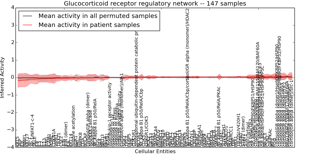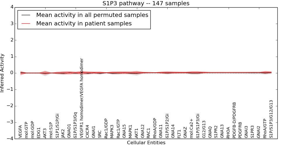 Figure S131. Get High-res Image This plot shows pathway concept perturbations across all samples against a permutation model. The concepts along the x-axis are sorted by lowest to highest mean activity for the real patient samples. Mean inferred activities are plotted along the y-axis as a colored band showing the average level and one standard deviation range. Real samples are shown in red and permuted samples in black.