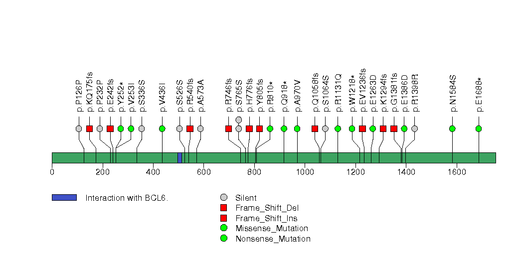 Figure S15.  This figure depicts the distribution of mutations and mutation types across the BCOR significant gene.