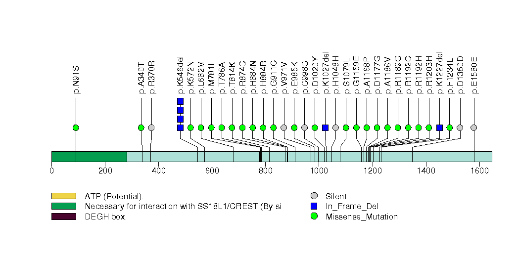 Figure S18.  This figure depicts the distribution of mutations and mutation types across the SMARCA4 significant gene.