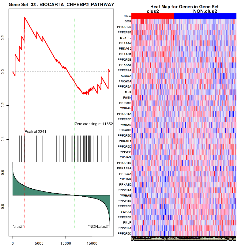 Table S29.  Get Full Table This table shows a Running Enrichment Score (RES) of each gene in this pathway, that is, the enrichment score at this point in the ranked list of genes. All genes are ranked by Signal-to-Noise (S2N), a measure of similarity as default and are used to obtain ES matrix of all genes. In this way, GSEA tool uses expression pattern of not only overlapped genes but also not-overlapped genes to produce ES matrix.