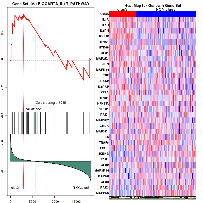 Figure S1.  Get High-res Image This plot shows mRNAseq_cNMF expression data heatmap (on the left) a RunningEnrichmentScore(RES) plot (on the top right) and a Signal2Noise(S2N) plot (on the bottom right) of genes in the pathway: BIOCARTA NO1 PATHWAY.