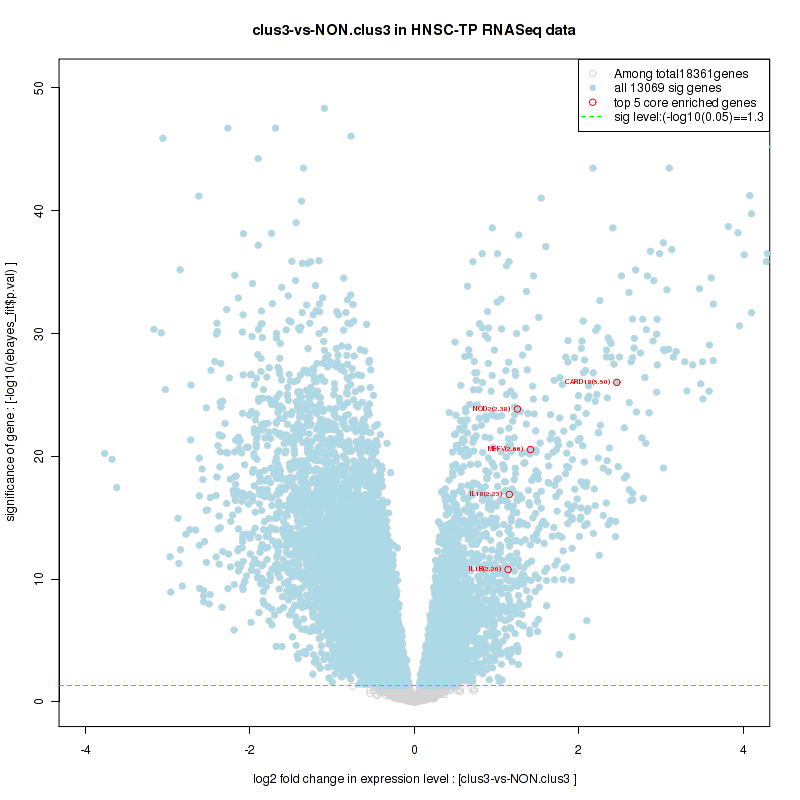 Figure S2.  Get High-res Image For the top 5 core enriched genes in the pathway: BIOCARTA NO1 PATHWAY, this volcano plot shows how much they are up/down-regulated and significant. The significance was calculated by empirical bayesian fit